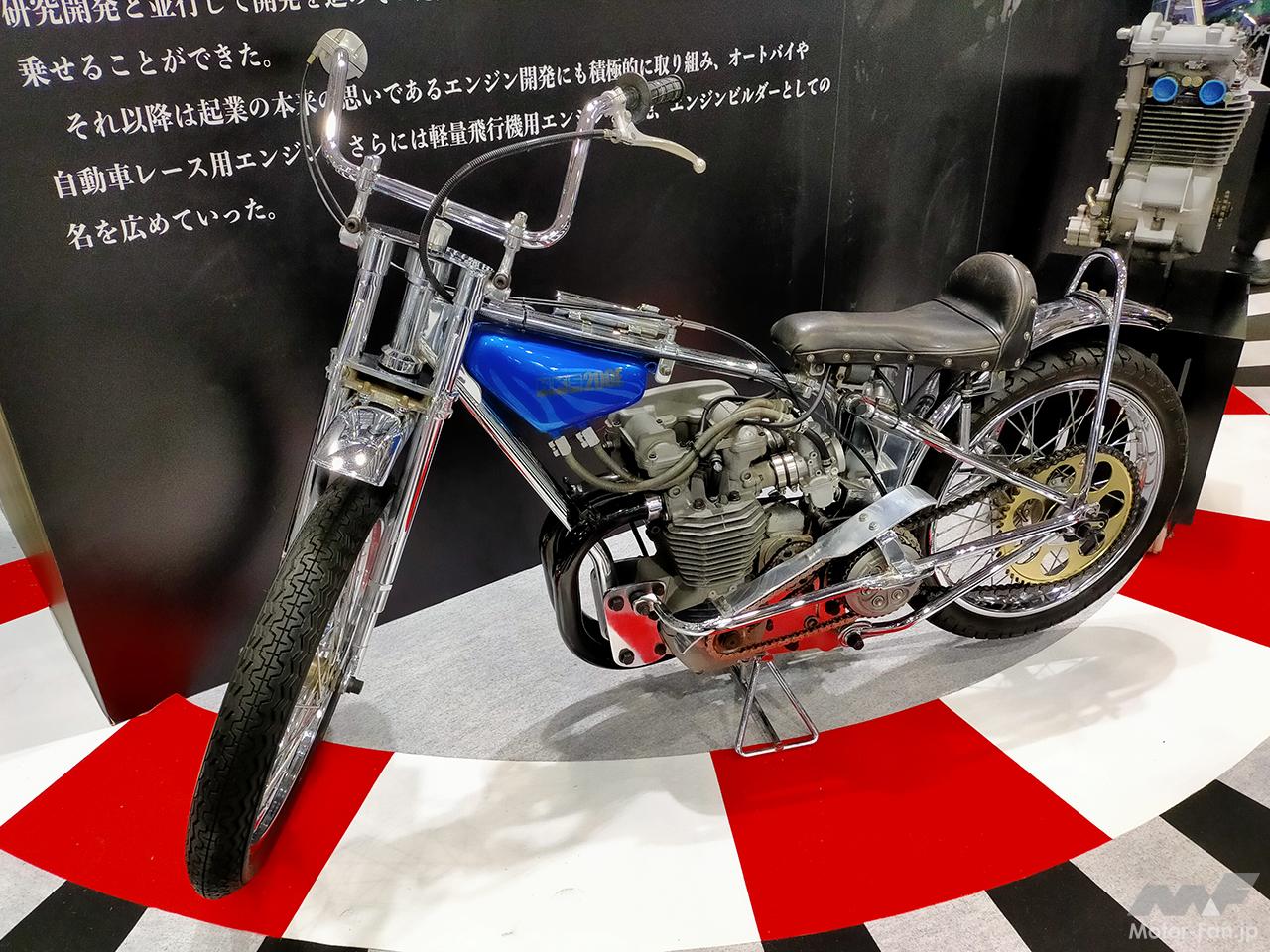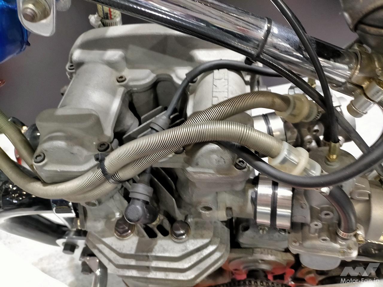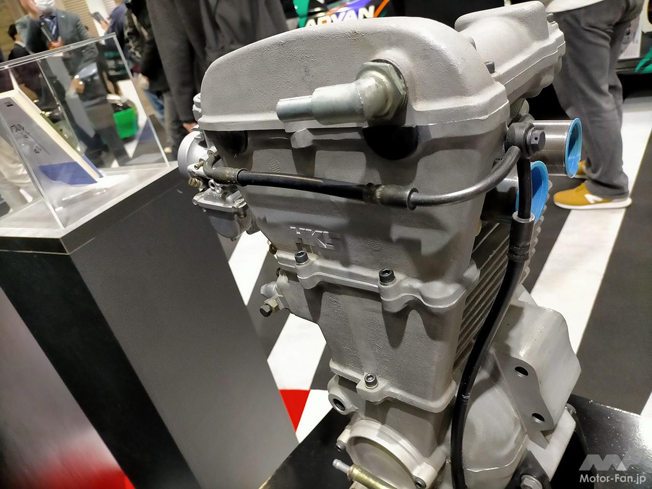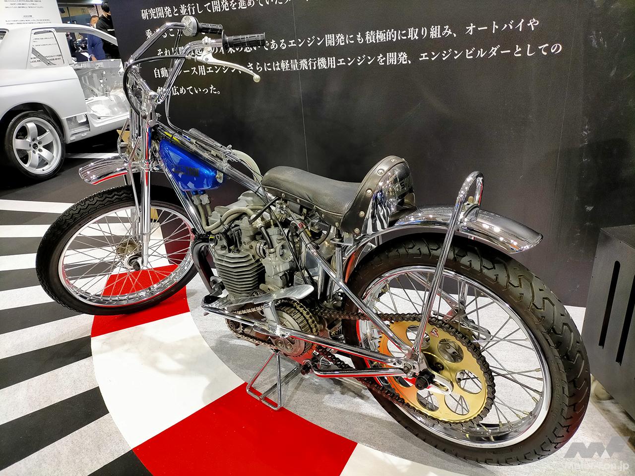 1973年に誕生したHKSは、長年自動車チューニングのパイオニアとして活躍する大手メーカーとして有名。HKSブースに展示された写真のバイクは、HKSが1988年(昭和63年)に開発した、「200E」を搭載したオートレースマシン。