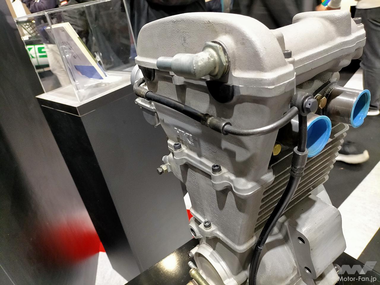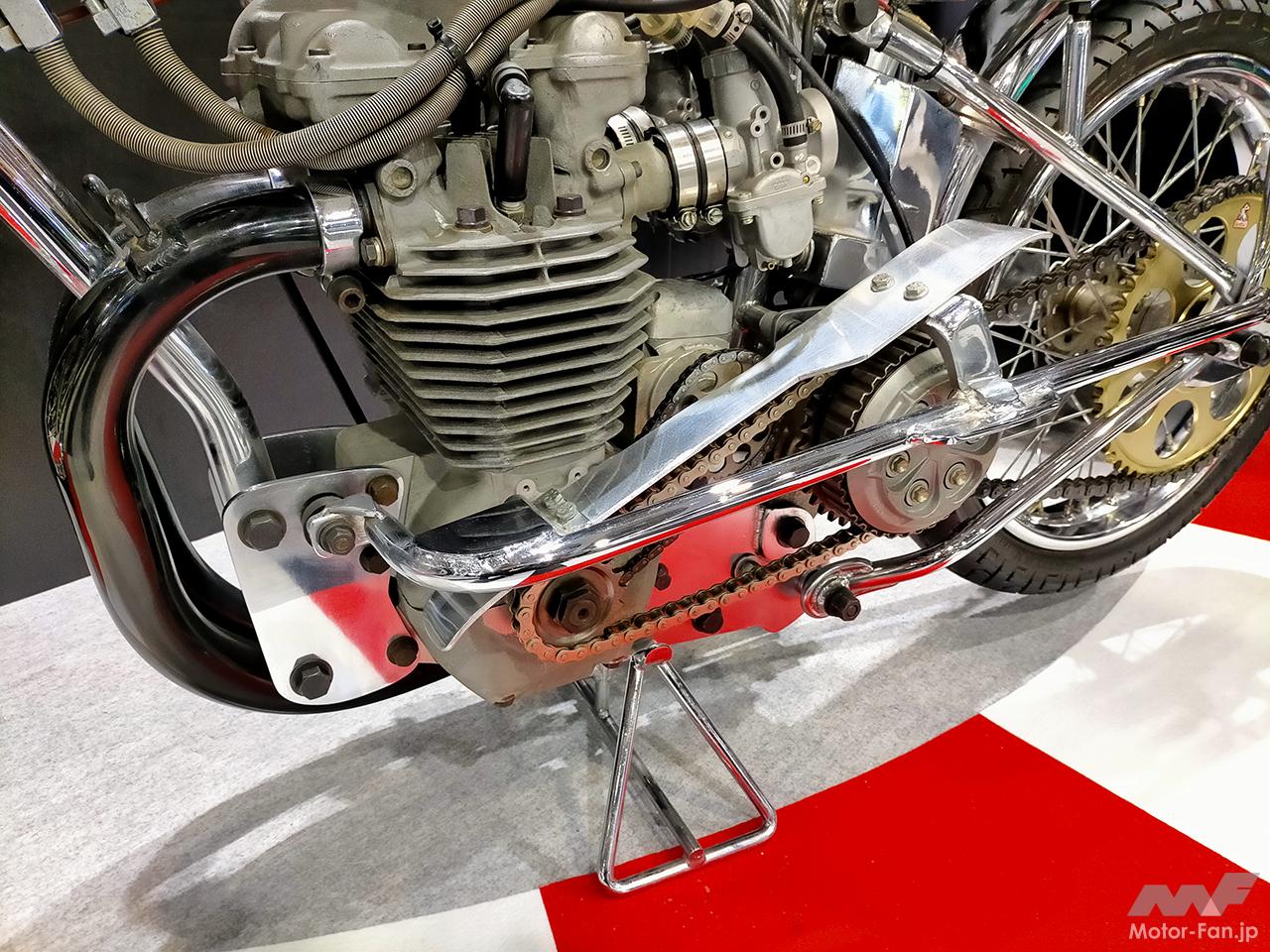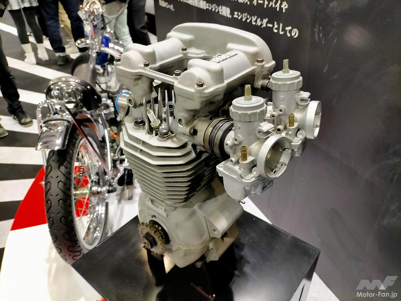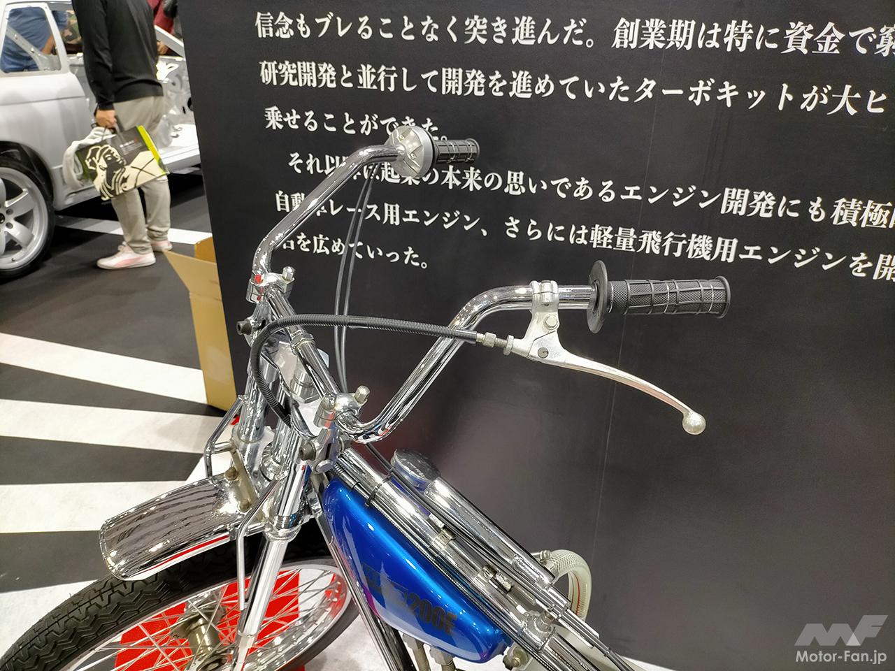 1973年に誕生したHKSは、長年自動車チューニングのパイオニアとして活躍する大手メーカーとして有名。HKSブースに展示された写真のバイクは、HKSが1988年(昭和63年)に開発した、「200E」を搭載したオートレースマシン。