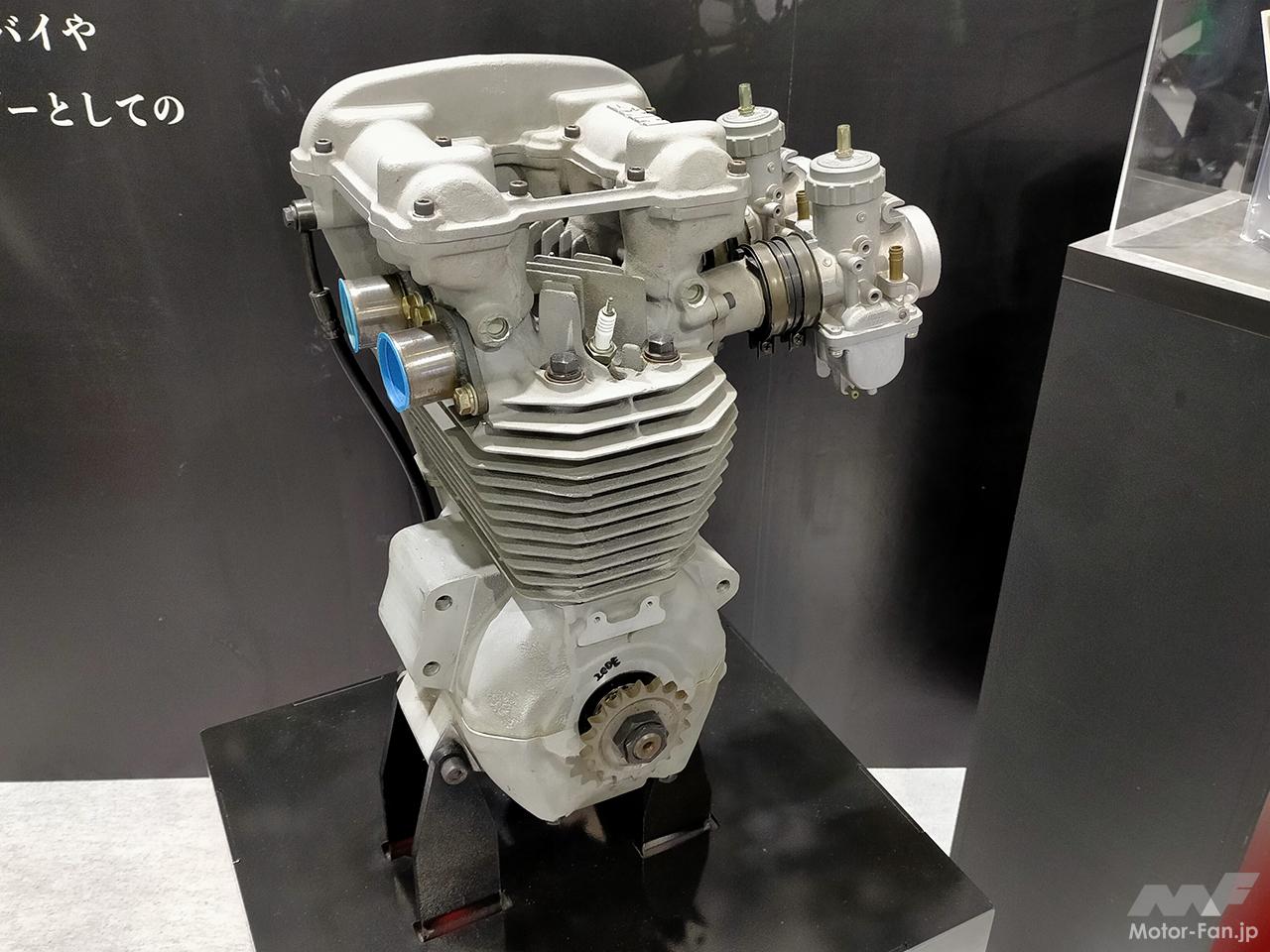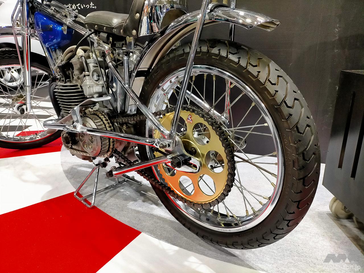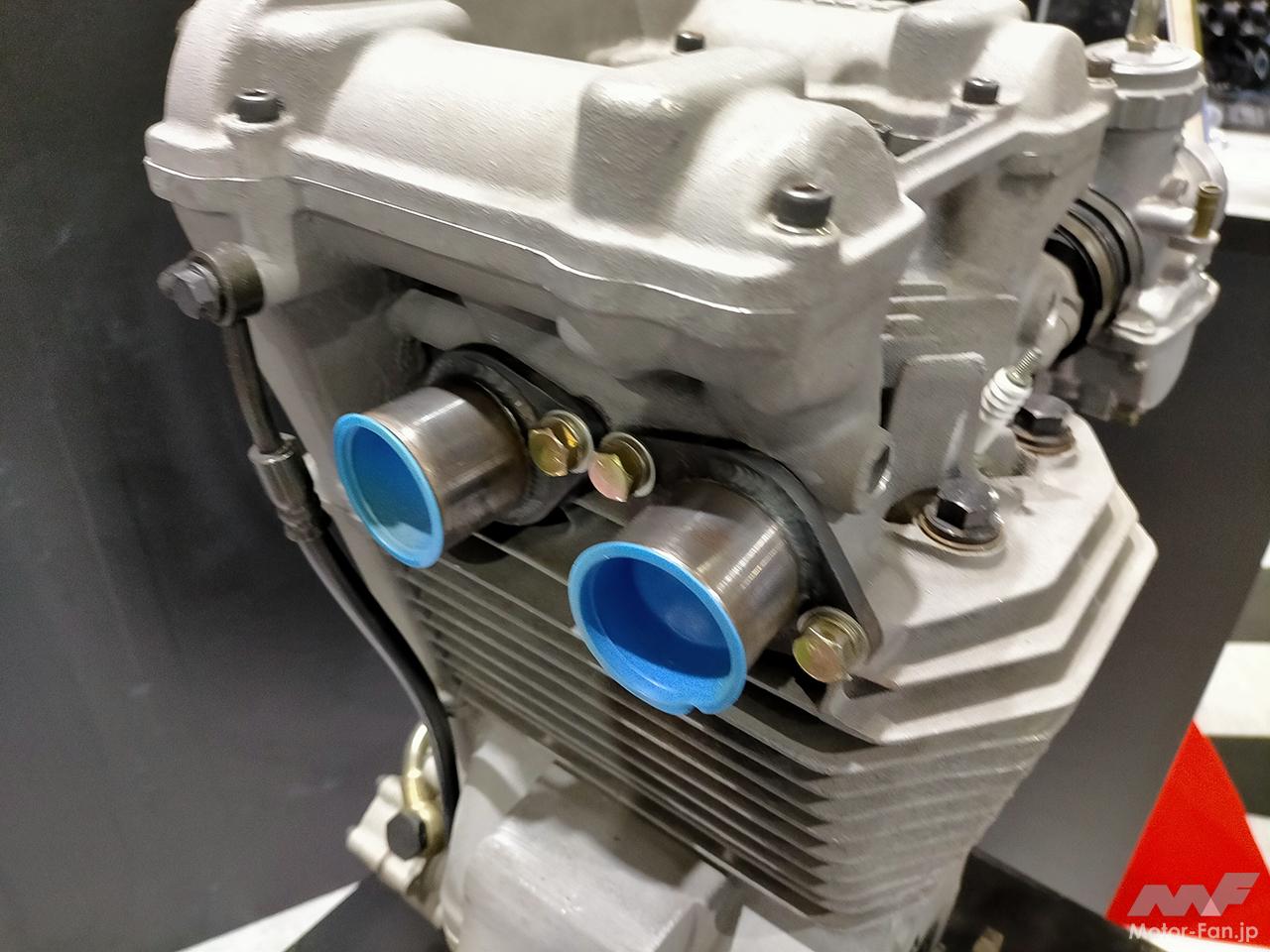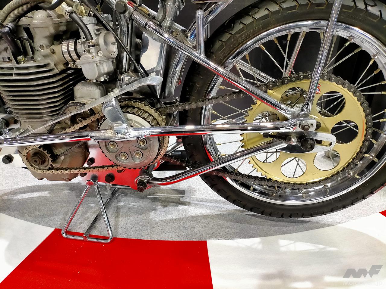 1973年に誕生したHKSは、長年自動車チューニングのパイオニアとして活躍する大手メーカーとして有名。HKSブースに展示された写真のバイクは、HKSが1988年(昭和63年)に開発した、「200E」を搭載したオートレースマシン。