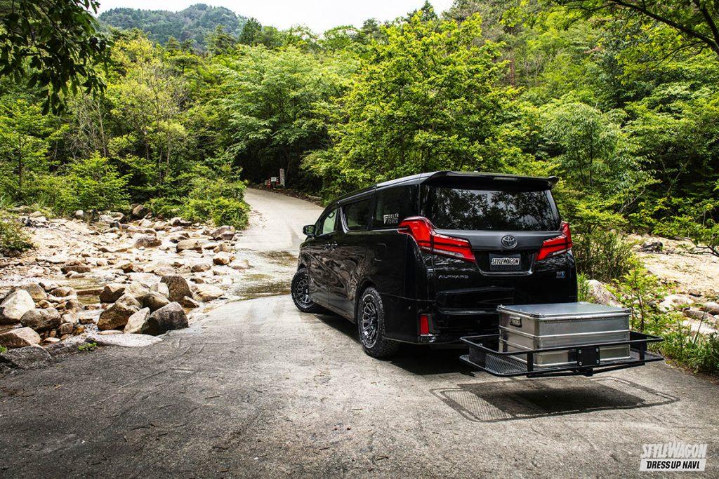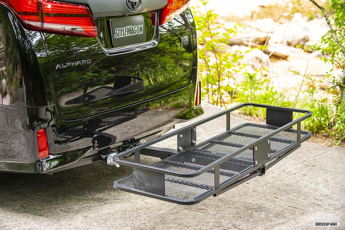 クロームデリート×ホイール&タイヤのみでも十分なオフテイストを発揮できるのだが、そこへさらにアウトドアギアをプラスすれば、方向性はより明確になる。デモカーの場合はそれがリアに搭載したヒッチカーゴ。見た目のインパクト、オフ感が爆上がりするのはもちろんだし、実際にアルファードでキャンプやアウトドアを楽しむのなら、実用面からもこうしたアプローチは有効。未使用時は折り畳めるから、街中での走行にも支障はない。ルーフラックやオーニングなどを組み合わせるのも効果的だ。