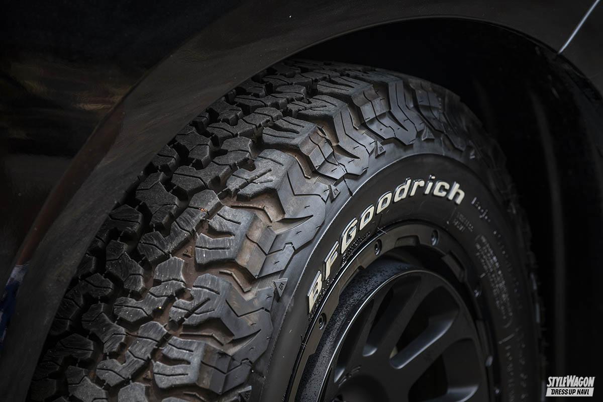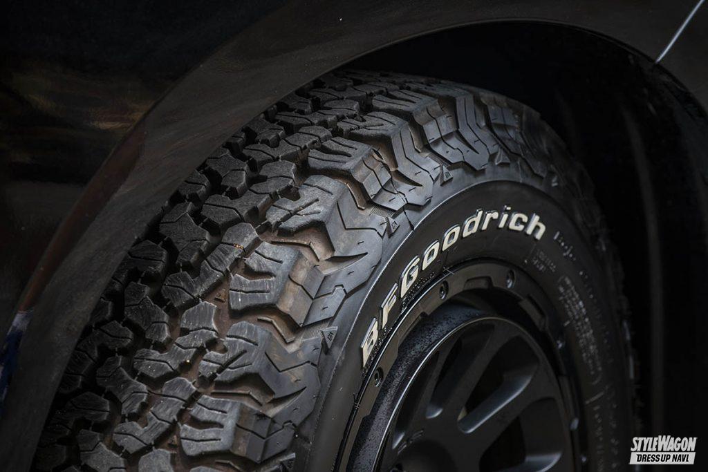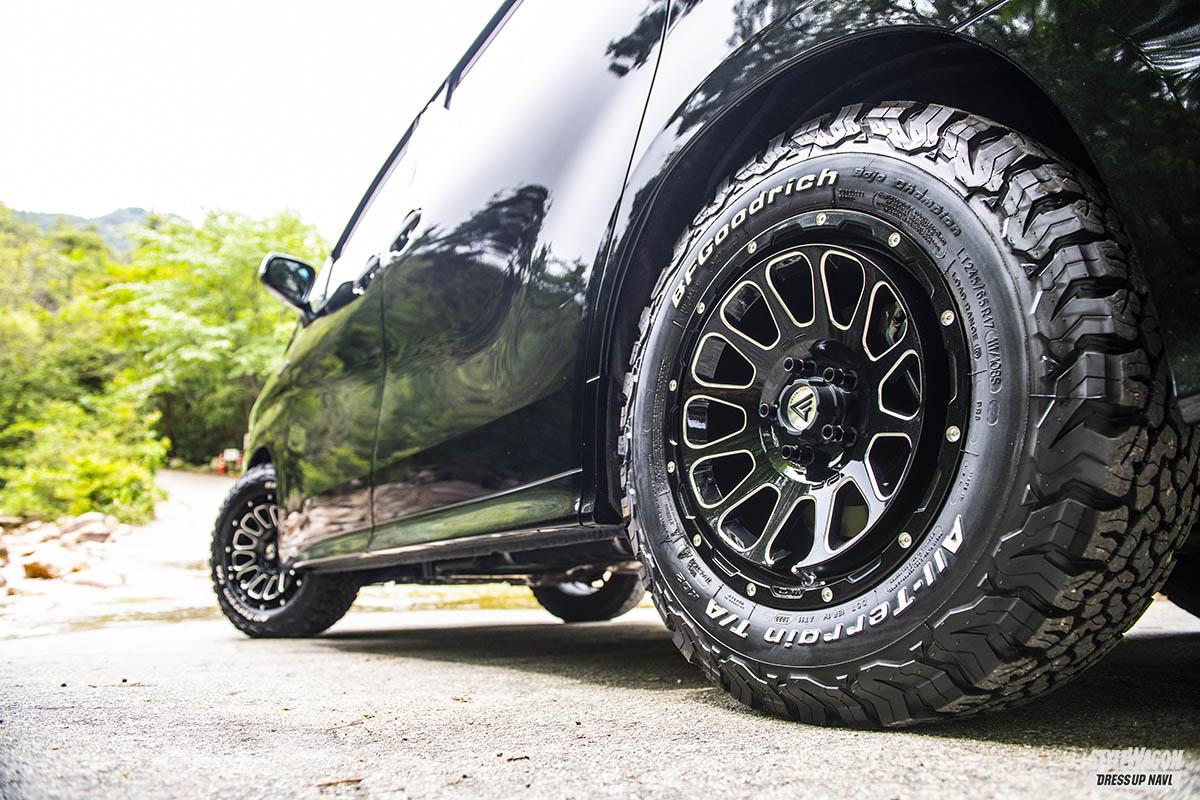 デモカーに装着されていたのはBFグッドリッチのオールテレーンT/A KO2。ゴツゴツしたワイルドなトレッドデザインで、しかもホワイトレターが採用されたモデルだからオフロードテイストの盛り上げには最適。アルファードであってもこのタイヤを履けば、グッと精悍でオフな印象で仕上げられるから注目だ。ちなみにデルタフォースのオーバルも、スパルタンすぎないとはいえれっきとしたオフ系モデル。ブロックタイヤとの相性に長けることは説明不要か。