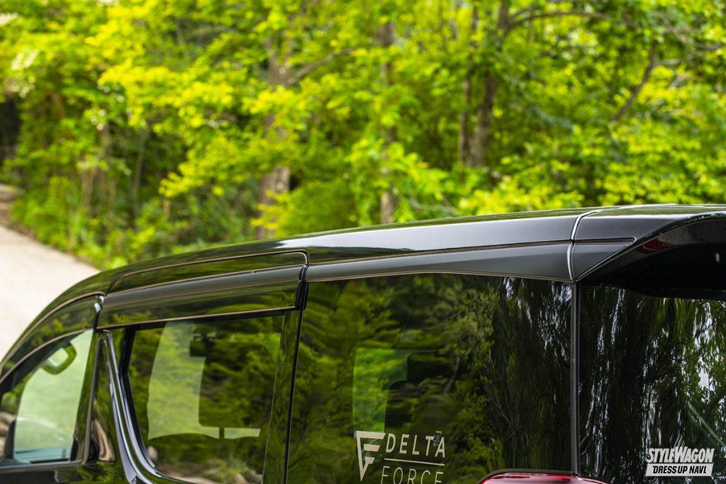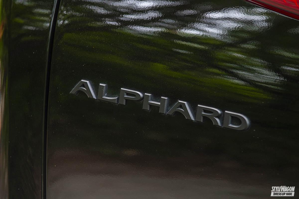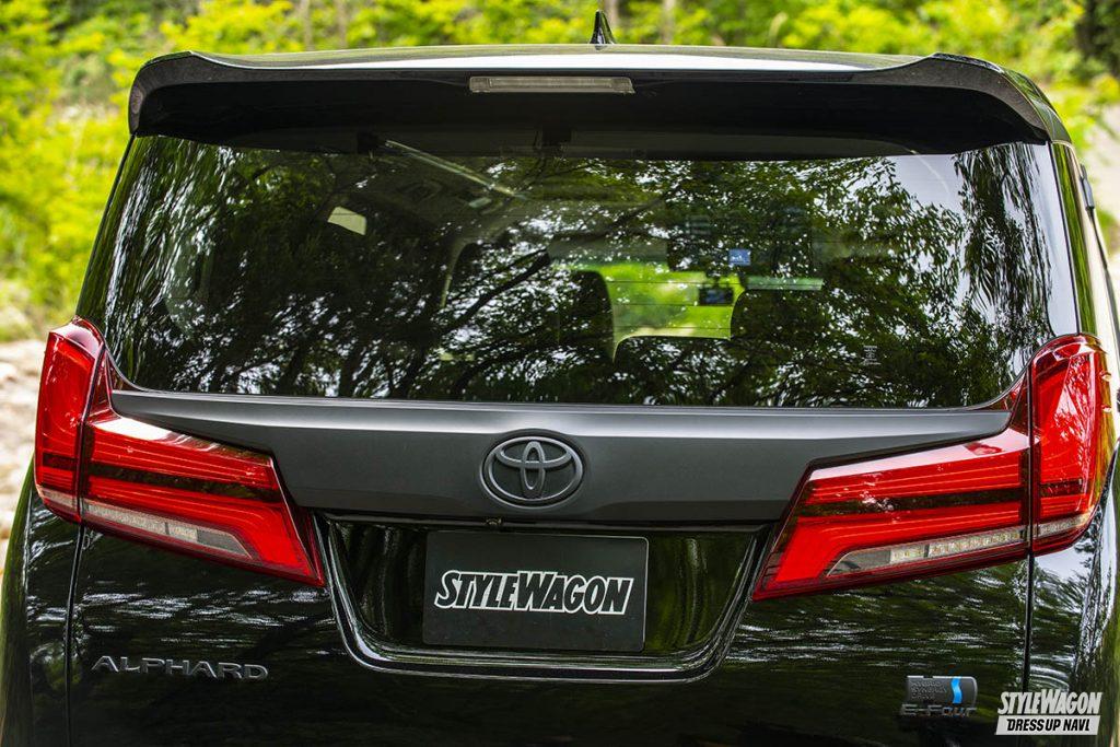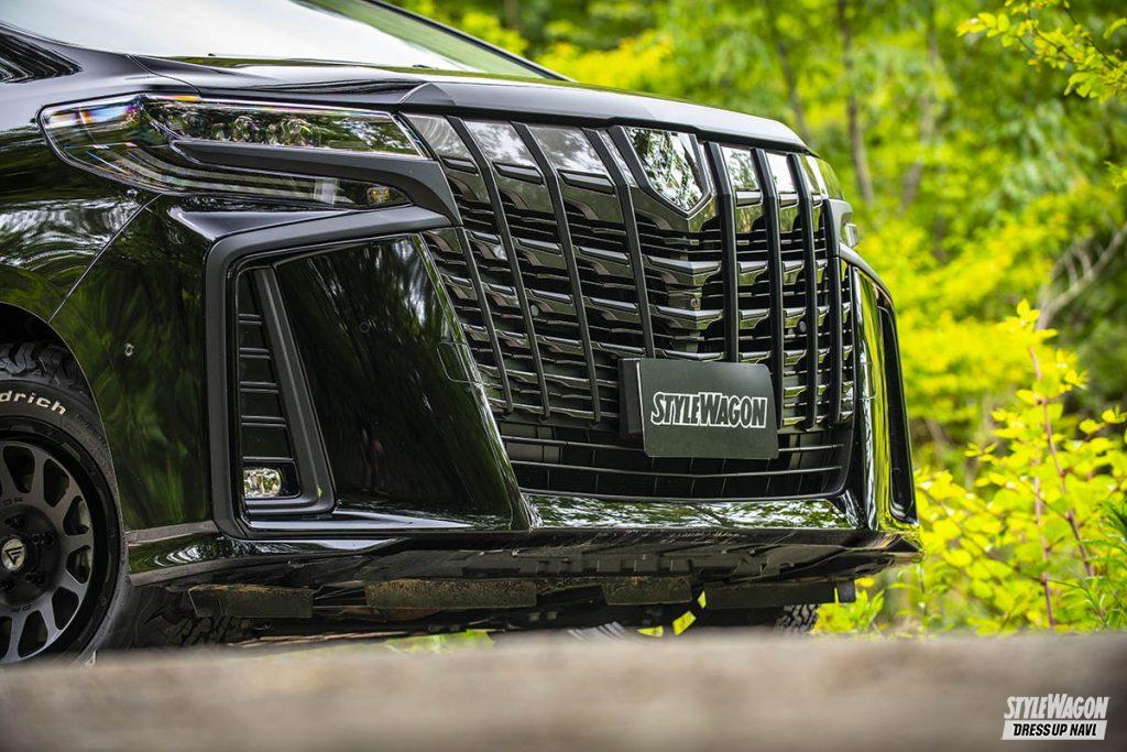 メッキはラグジュアリーの象徴で、アルファードの特徴でもあるパーツ。だからこそそれを徹底的に消去してしまえば、全体のイメージを劇的に変えることができるのだ。印象的な大型グリルはもちろん、デイライト周辺のメッキガーニッシュ、リアガーニッシュなど、デモカーでは装着されているすべてのメッキパートを、マットブラックの塗装でチェンジ。それでいてハイブリッドのブルーはあえて残すというメリハリの効いたコーデ術で、マッシブさだけでなくアルファードらしさも絶妙に薫らせているのがポイントだ。セミグロスやグロスのブラックという選択肢ももちろんアリだが、マットはアーミー感も備わるためオフ系に振るならオススメ。ぜひともチャレンジを。