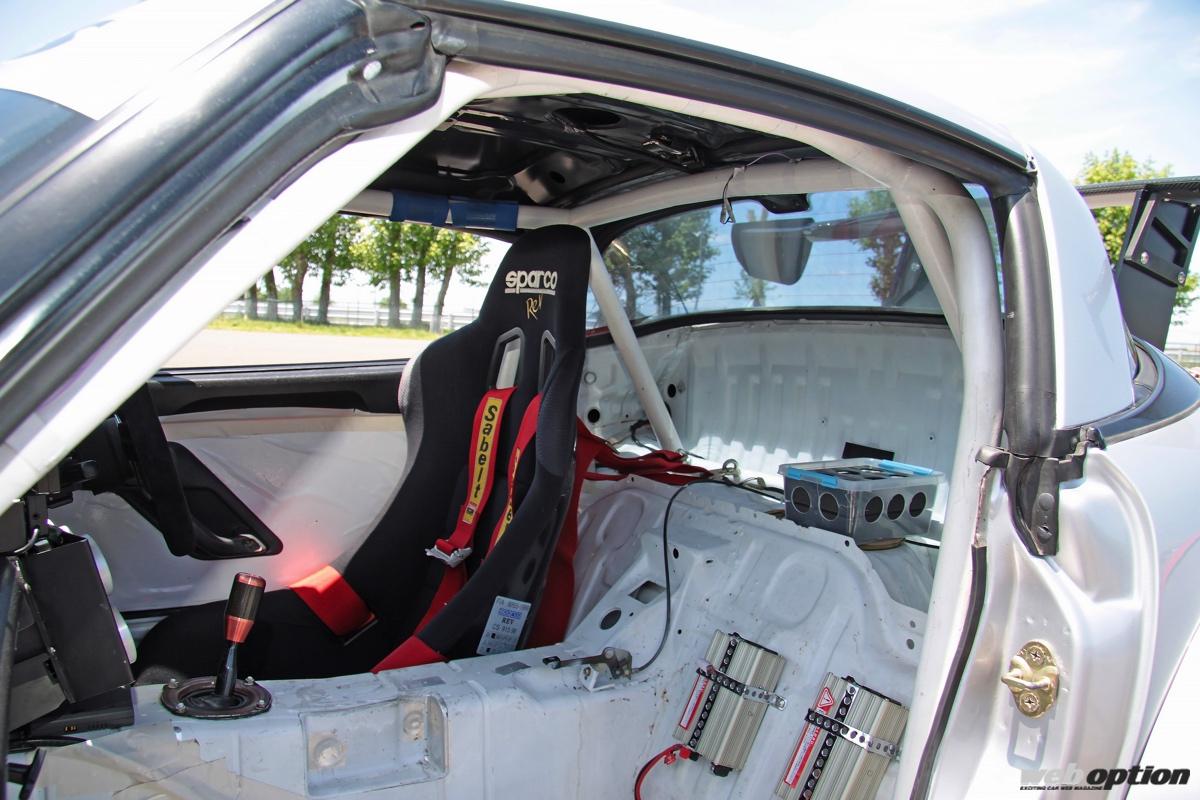 スーパーGTマシンを彷彿とさせるワイドフェンダー仕様のエアロは全てワンオフ。拡幅は片側70mmにもおよび、強烈なダウンフォースを発生する空力パーツとの相乗効果で、高速コーナーでの安定感はピカイチだ。
