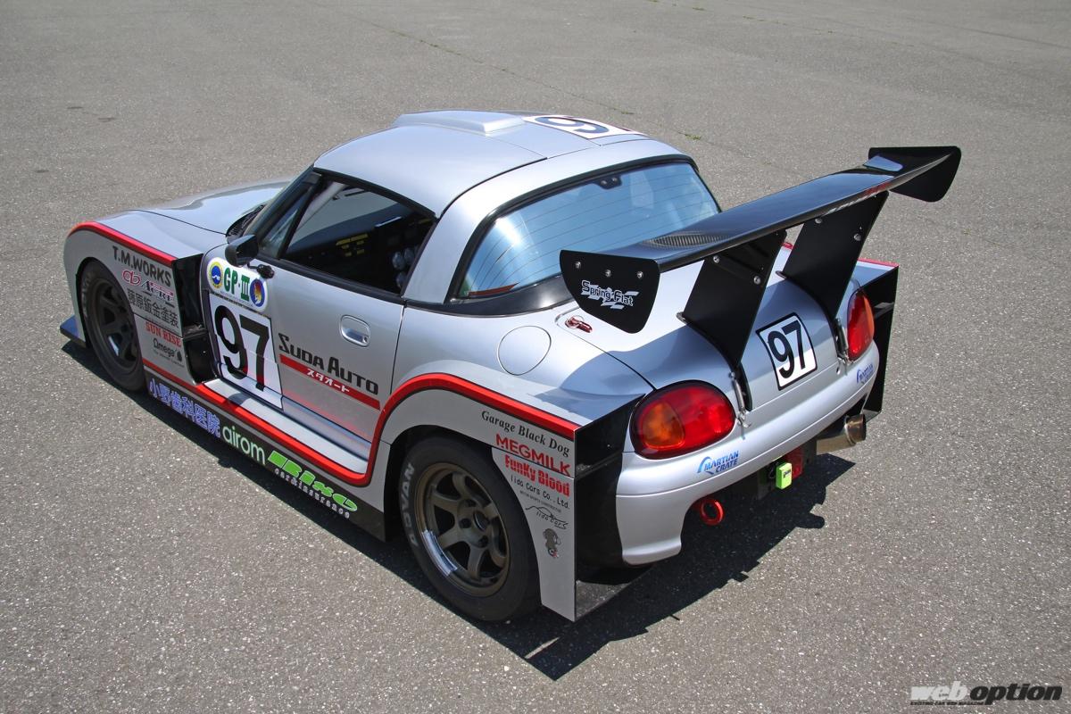 耐久レース用に製作されたカプチーノの登場だ。FR駆動の過給機付きということでカプチーノをベース車に選んだそうだが、とにもかくにもエクステリアが凄まじい。