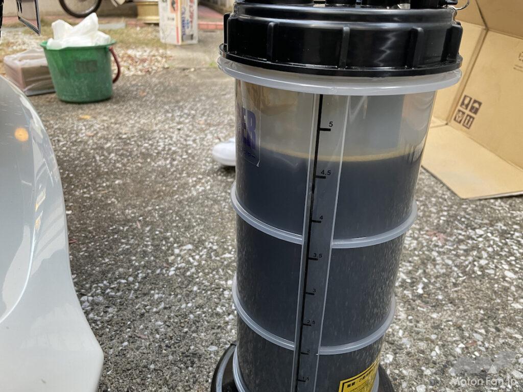 実際交換するとフィルター交換をして約5L。取扱説明書どおり。これまでならもう1L缶を開けなければ足りなかったが、5缶でピッタリである。