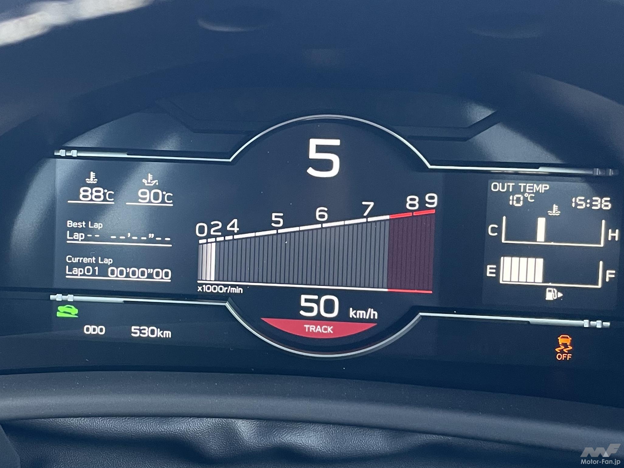 この温度を見ている限り、高速巡航でも100℃くらいになっているので、初代に比べて油温はやはり抑えられているよう。すでにサーキット走行も行なったが、油温は110℃くらいまでしか上昇せず、オイルクーラーの効果を実感できた。