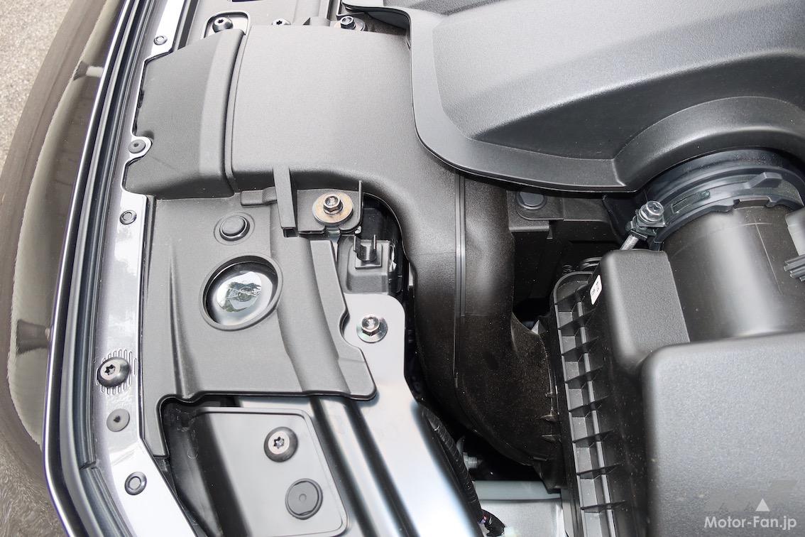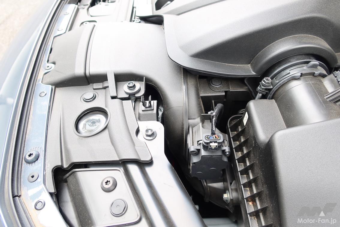 エンジンルームを覗いたときの変化には気づいた(物理的な違いはわかりやすい)。フロントグリルからエアクリーナーまでフレッシュエアを導くダクトに付いていた温度センサーが一部商品改良後のモデルではなくなっている(センサーの有無とともにフレッシュエアダクトの容量の違いにも注目)。点火プラグの火花に頼らない自着火を成立させるには温度の管理が非常に重要。そのため、e-SKYACTIV X には“保険“の意味も込めて吸気系の最上流に温度センサーを設置していたのだが、開発が進んだことにより、なくても吸気の状態を精度高く推定できるようになった。そのため、温度センサーを取り去ることにしたのだという。