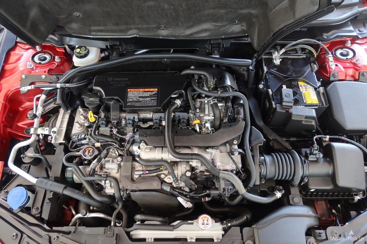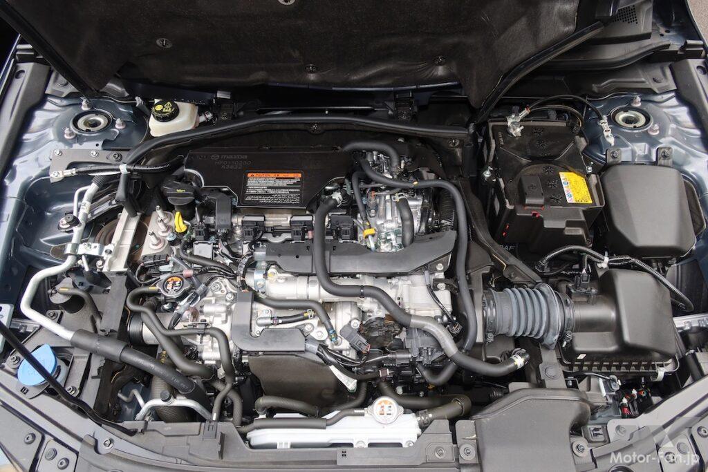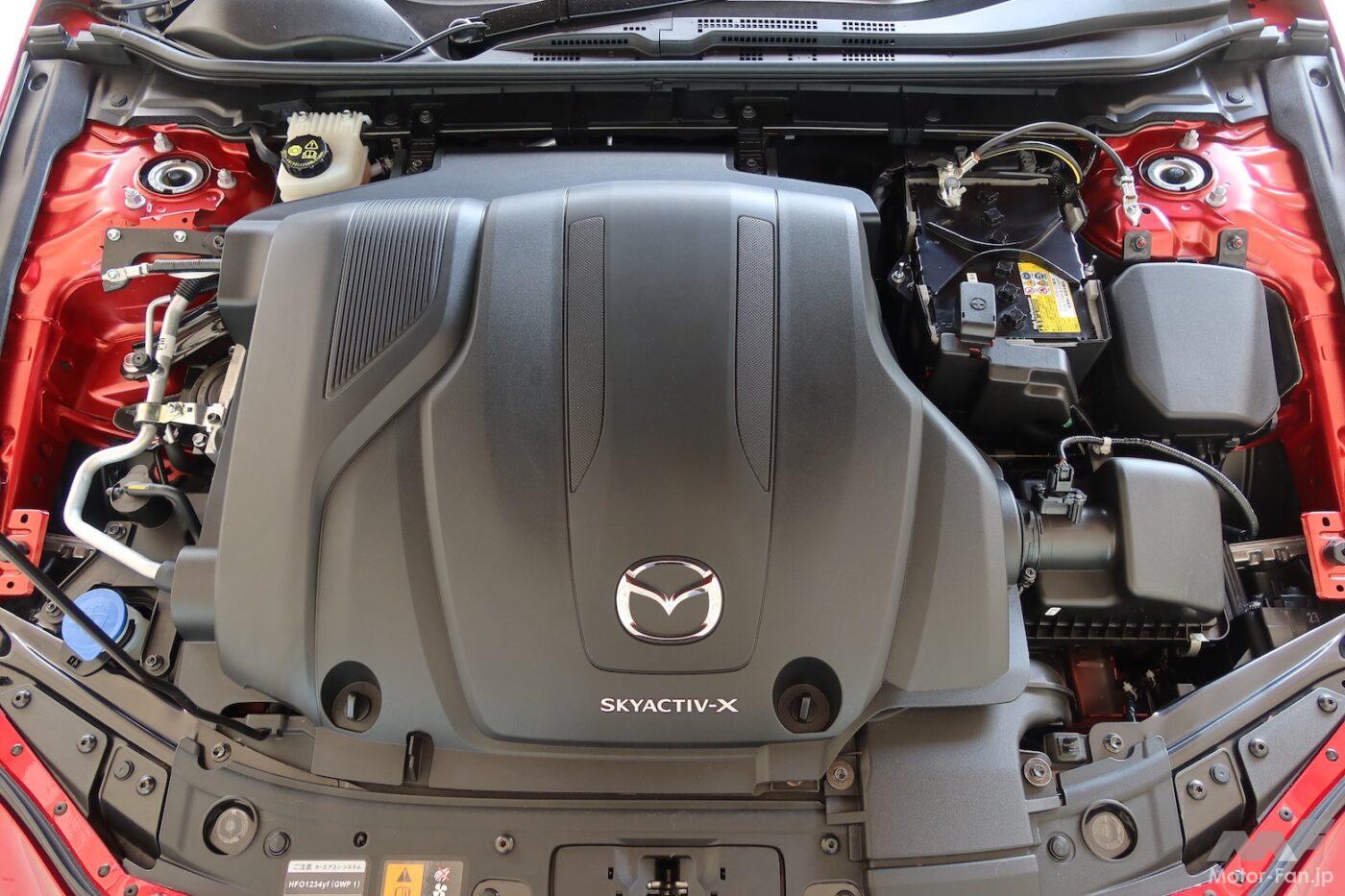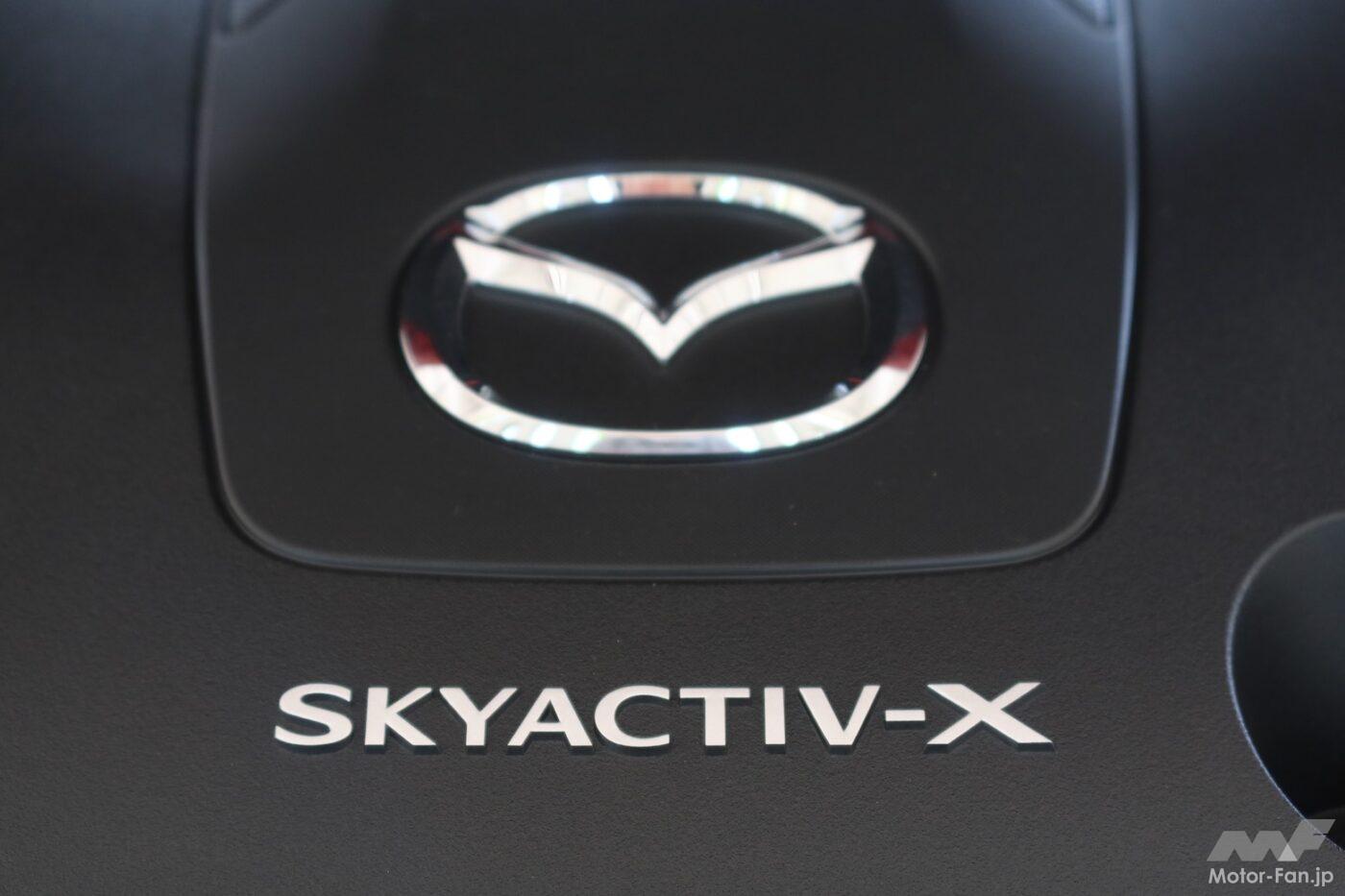 マツダ独自技術の火花点火制御圧縮着火(SPCCI)により気持ちのいい走りと環境性能を両立した新世代ガソリンエンジンのe-SKYACTIV Xは、吸排気エンジンサウンドを進化させている。具体的には、「吸気口やサイレンサーの部品を変更し、加速時のエンジンサウンドを強調」「シフトアップごとに変速のタイミングとサウンドの変化がシンクロすることで、停車時から発進加速するシーンでリズムよく変速する気持ち良さを高めた」と説明している。
