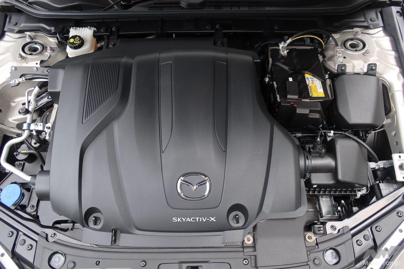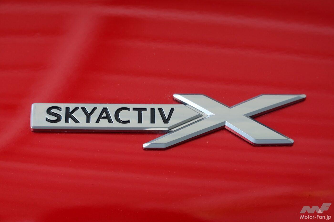 e-SKYACTIV X搭載車のブラックトーンエディションは、ドアミラーがグロスブラック仕上げになり、シートにレッドステッチが施され、追従走行時のステアリングアシスト機能を指すクルージング&トラフィック・サポート(CTS)が追加される。1.5Lと2.0Lガソリン、1.8Lディーゼルのブラックトーンエディションの場合はグレーメタリック塗装のホイールがブラックメタリック塗装になるのだが、e-SKYACTIV X搭載車はもともとブラックメタリック塗装のホイールを装着しているので、この点での変化はない。むしろ、X以外のエンジンを搭載する機種がXと同じホイールを装着するのが、ブラックトーンエディションの特色である。