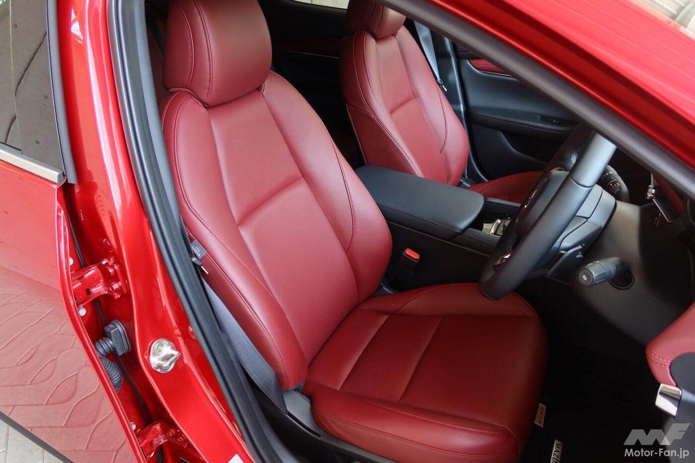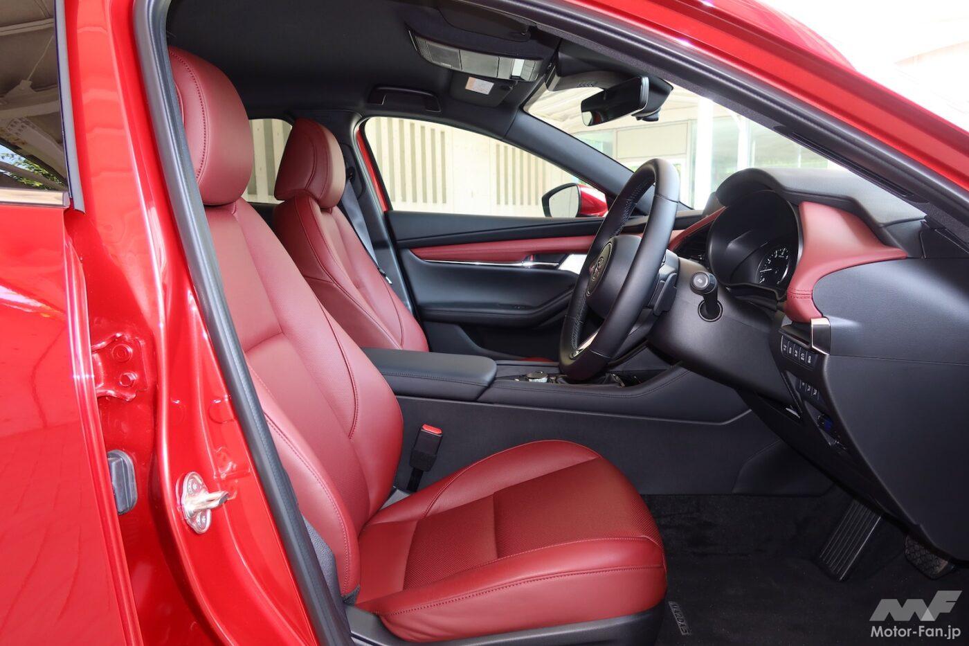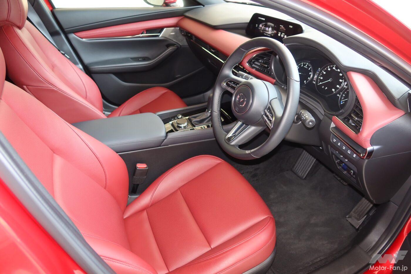 2021年10月28日に行なわれた一部商品改良のポイントとして、ターンランプがCX-30で採用済みのディミングターンシグナルになったのも大きい。パッと光ってジワッと消える、鼓動を打つような生命感ある点滅の仕方が特徴で、最新のMAZDA3であることがひと目でわかる変更だ(ターンランプ作動時に限られるが)。メーターに表示される矢印もディミング(ゆっくり消灯)するので、ターンランプ作動時は最新の仕様に乗っていることが実感できる。試乗時はたびたび、先行車や後続車のボディに反射する光でディミングターンシグナルを実感した。変化がわかりやすく、最新のMAZDA3に乗っている実感が湧く。