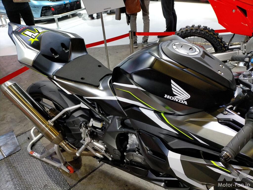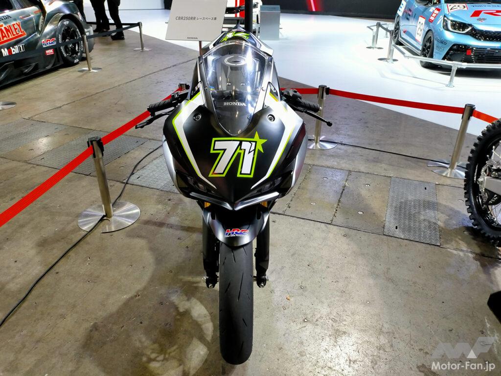 東京オートサロン2023に展示されたCBR250RRは、2022年12月に発表されたブラックカラー+ロゴのみのシンプルな外観とは異なり、外装パーツにレーシーなグラフィックを施し、フロント部に71のゼッケンナンバーを配しており、レース仕様車に相応しい、アグレッシブなイメージが演出されていた。