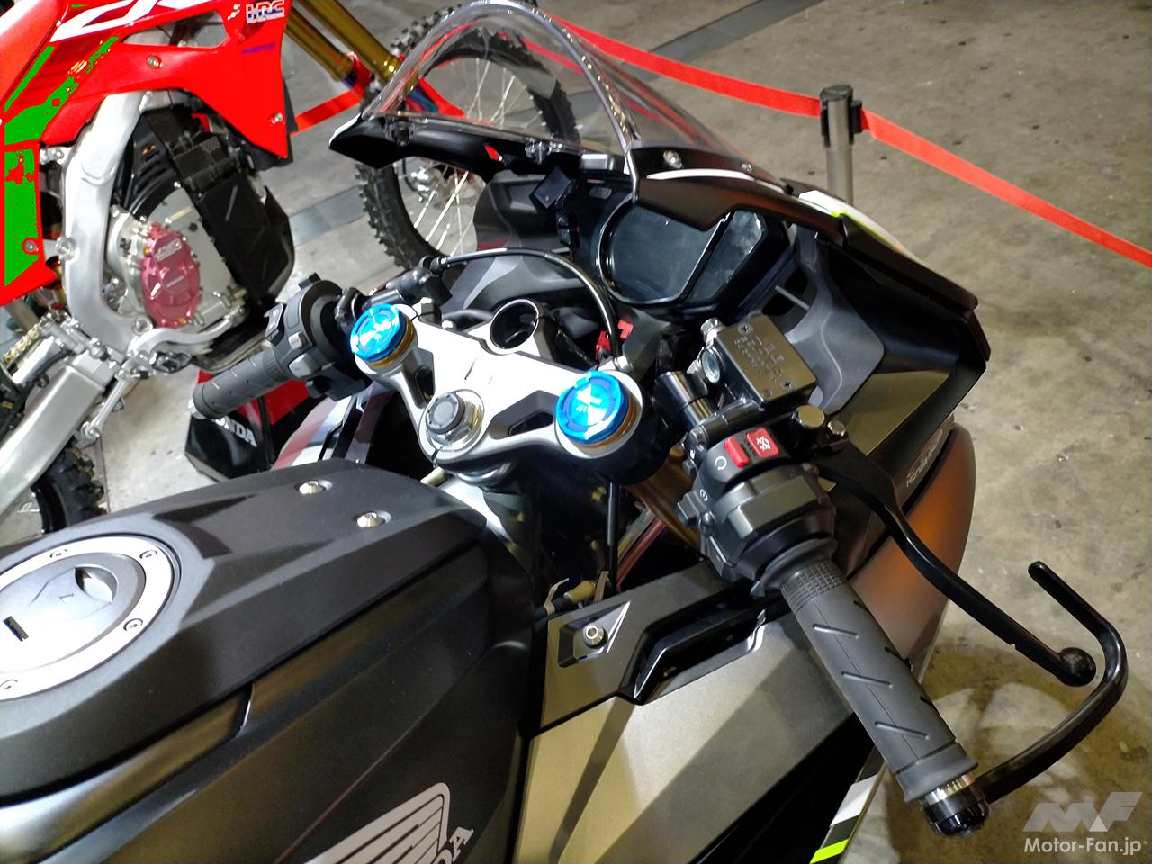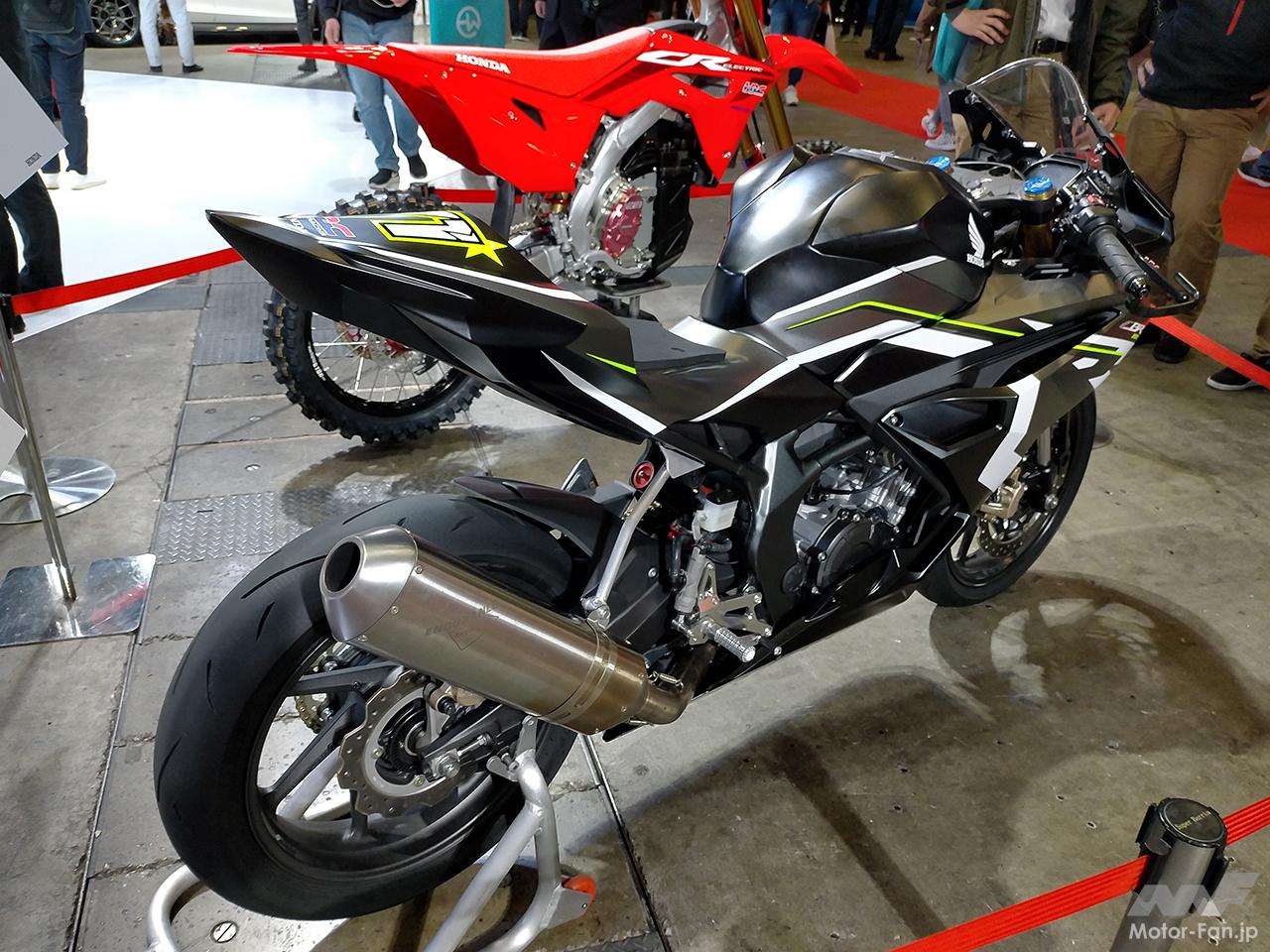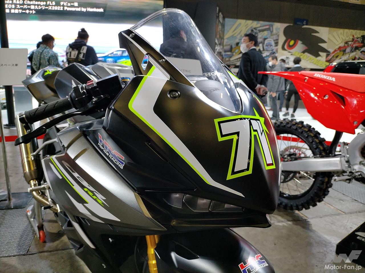 東京オートサロン2023に展示されたCBR250RRは、2022年12月に発表されたブラックカラー+ロゴのみのシンプルな外観とは異なり、外装パーツにレーシーなグラフィックを施し、フロント部に71のゼッケンナンバーを配しており、レース仕様車に相応しい、アグレッシブなイメージが演出されていた。