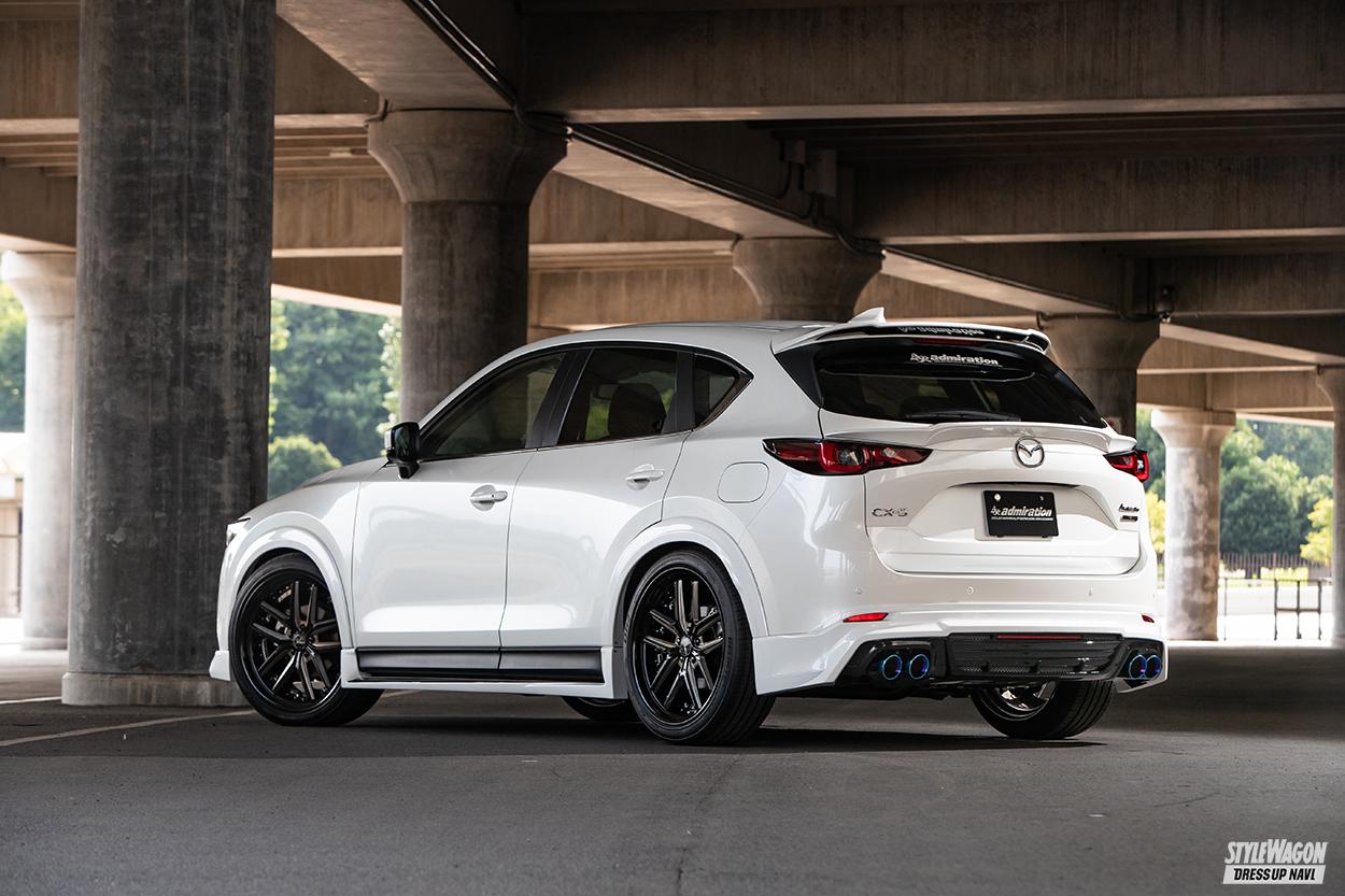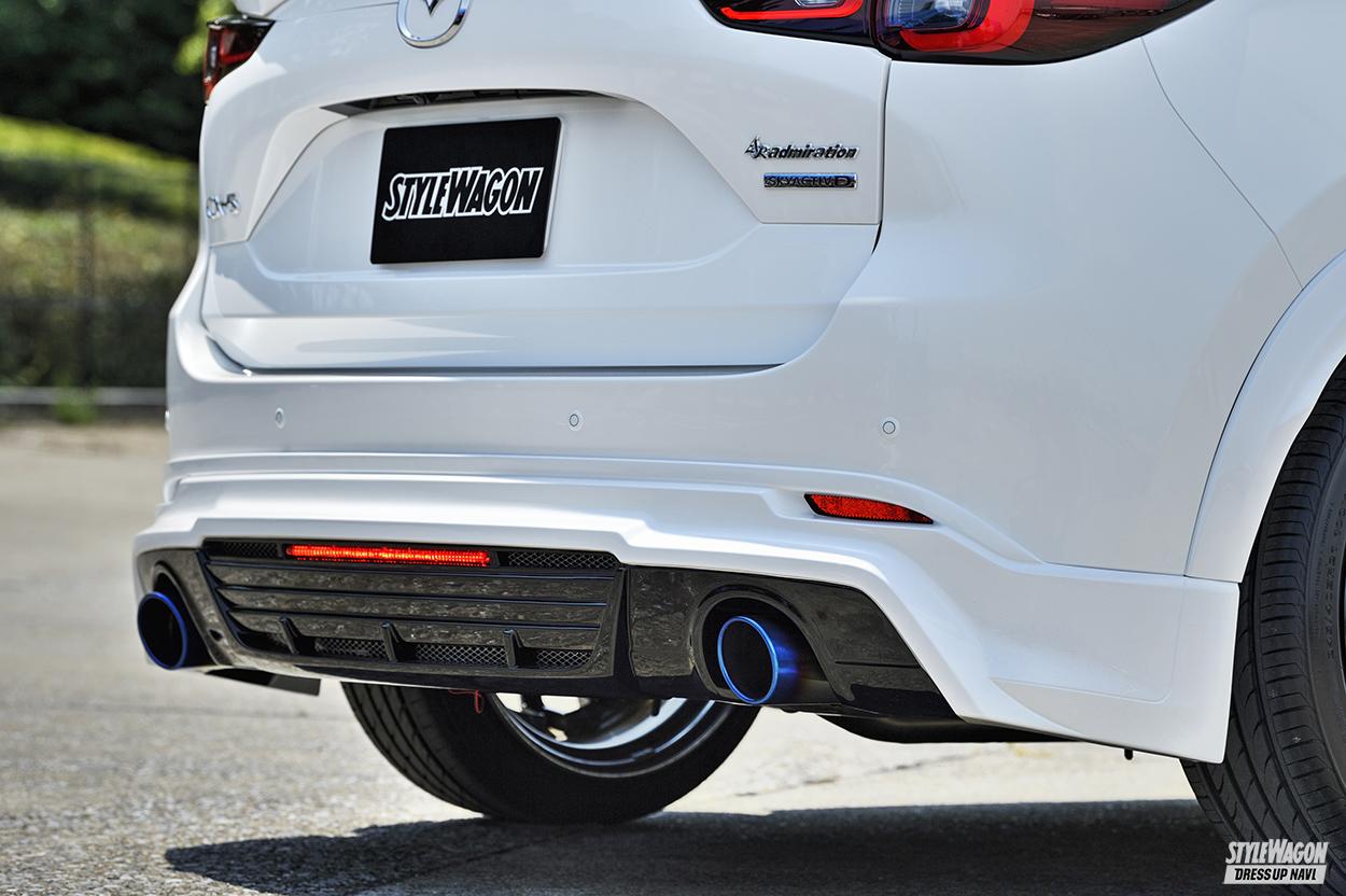 最新モデルとなるCX-5(MC後)は、シリーズ初となる真円デュアルを採用した「エグゼクティブエキゾーストフィニッシャー」。ベルタハーフタイプのエアロも、マフラー形状にあわせて、新たに専用設計されているのもポイントだ。