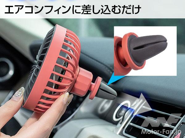 エアコンルーバーにクリップで取り付けられる小型扇風機。エアコンの冷風を車内に効率よく届けるサーキュレーターとして活躍してくれる。ボールジョイントによって360°自在に角度調整が可能だ。