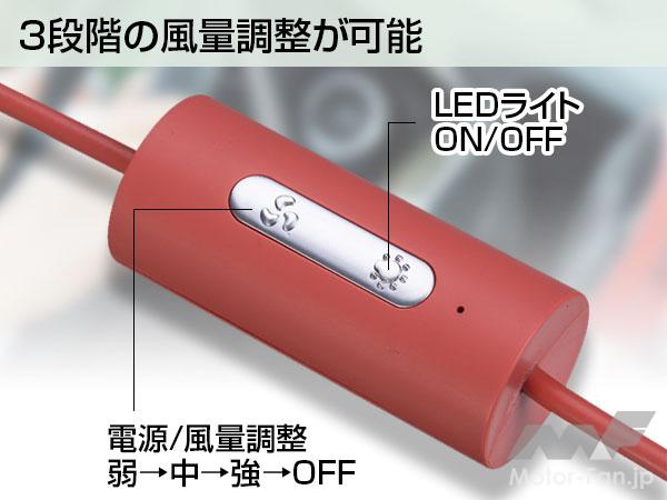 風量は弱/中/強の3段階で小型リモコンスイッチにより手元で切り替えが可能。ファンの部分にはLEDライトも内蔵されている。