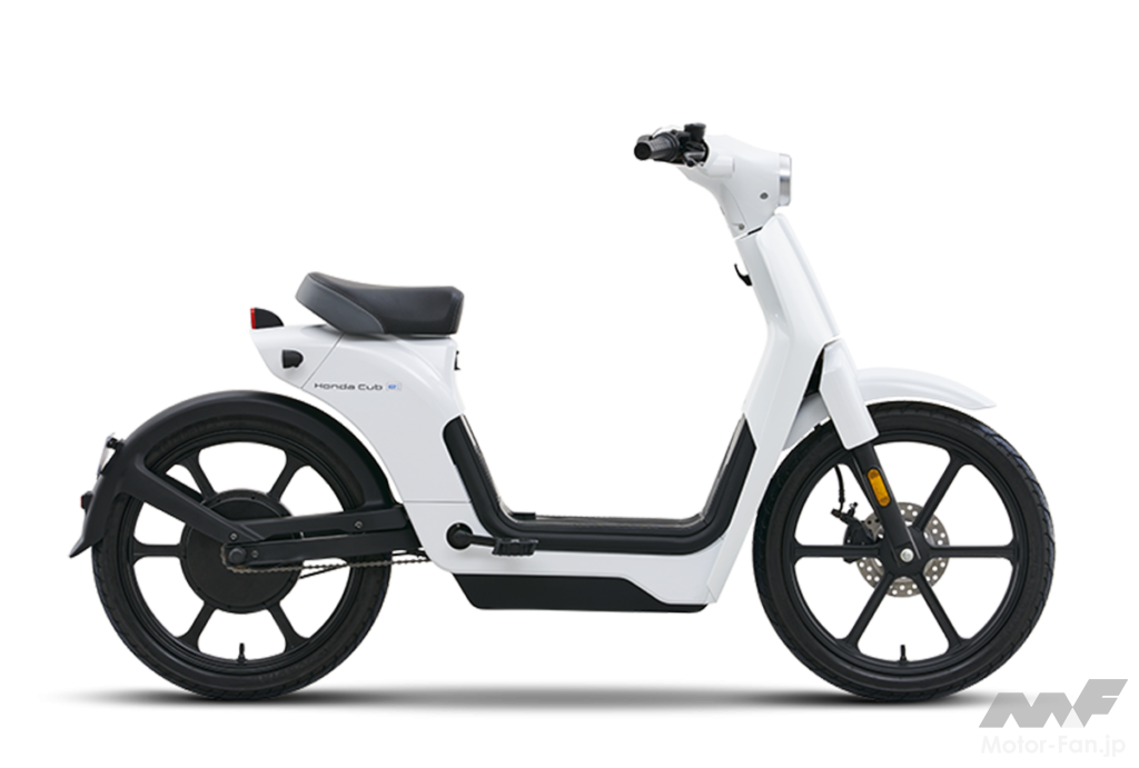 ホンダ・カブ・イーのボディサイズは全長1,839mm×全幅639mm×全高1,066mmで、ホイールベース(軸距)は1,235mm、重量は53.6kg、前後ホイールはスーパーカブ伝統の大径17インチ。