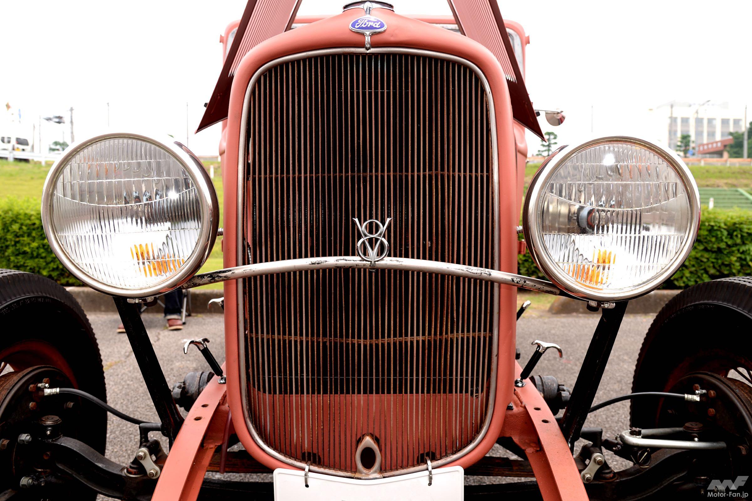 モデルBも爆発的なヒット作だったとは言い難いものの、V8エンジンという新たな価値観を創出して評価されることとなった。これら戦前のモデルはフォードに限らずアメリカ全土に普及していたから、古くなった中古車も豊富に存在した。スポーツカーがまだ発売されていなかったアメリカで、これら中古車たちは格好の改造ベースになっていく。新車を買えない若年層が重いパーツを取り去りエンジンをチューニングしたりV8に載せ換えて、スポーツカーのように速さを競って楽しむのだ。これが第二次世界大戦後にカリフォルニアを中心として盛り上がりを見せたホットロッド文化へとつながっていく。例えば映画『アメリカン・グラフィティ』には進路が決まり地元を離れることになる若者たちが、1932年型フォード・モデルB「デュース」で走り回る姿が描かれている。「デュース」は軽量化を施したことでV8エンジンの速さを際立たせたホットロッドの代表的な存在。映画を見て憧れたという人も多いことだろう。6月18日に取材した「クラシックカーヒストリックカーミーティングTTCM」の会場で、一際目を引くホットロッドが展示されていた。近くで会話をしている人たちの話を聞くでもなく聞いていると、やはり「アメリカン・グラフィティに出ていた〜」と盛り上がっている。会話の主であるモデルBオーナーにお話を聞いてみることにした。