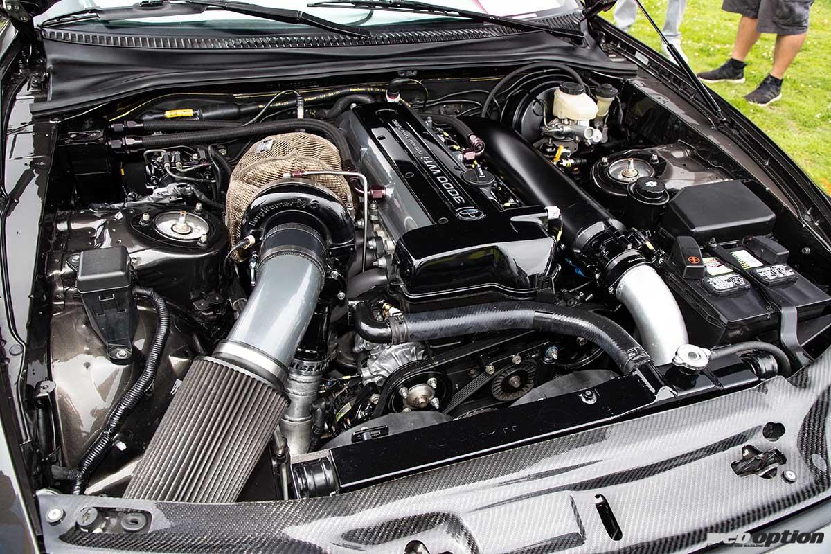 アメリカではレクサスSCとして販売されていたJZZ30系ソアラ。下位グレードにあたる「SC300」はNAの2JZ-GEを搭載していたが、こちらはターボの2JZ-GTEに載せ換え、さらにトランスミッションにT56シーケンシャル6速を採用。ブラック+ホワイトでシックにまとめられたエンジンベイも見事だ。ブレーキにはクライスラー&ジープ系のSRT8純正ブレンボを流用する。