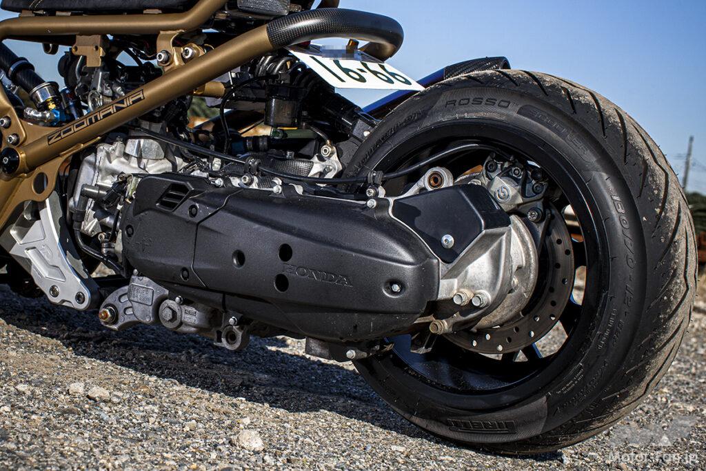 ホンダ ズーマー+ホンダ PCX125/150用エンジンの組み合わせが人気の理由。それはワイドホイールが履けること。車体とエンジンが同メーカーであること。(一般的にバイクのカスタマーは、同メーカーにこだわるユーザーが多い)。車体とのマッチング性が良好なこと。ノーマルのズーマーと同様、高性能な水冷式であることだ。