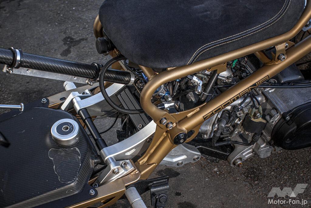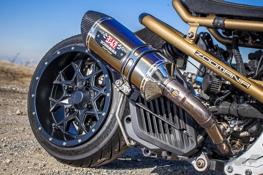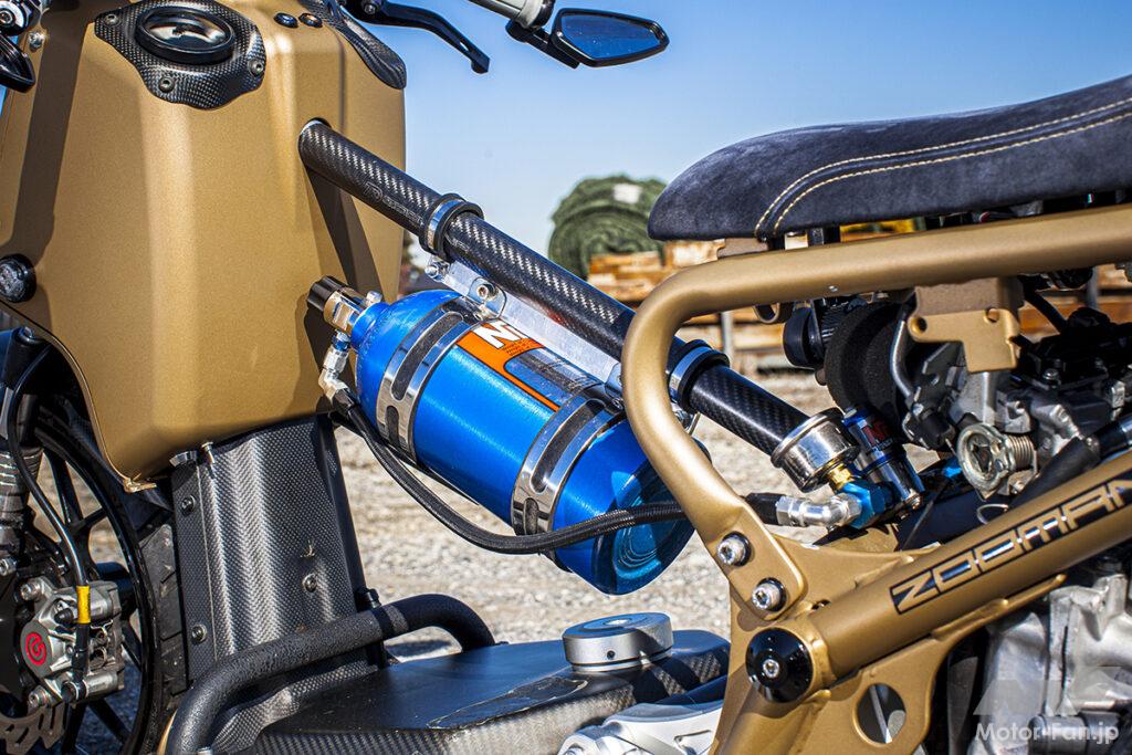 ヨシムラジャパン製マフラー、3連のプロジェクターヘッドランプ、カーボン製フロントフェンダー、肉薄のスライスシートなど、ズーマーのフォルムを活かしたアイテムが随所に投入されている。