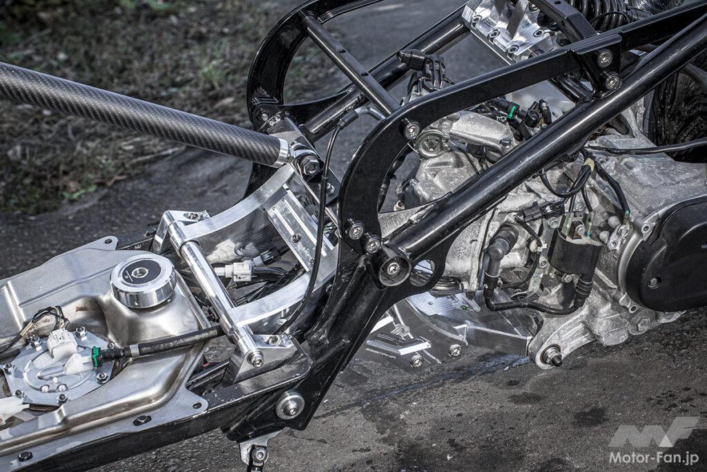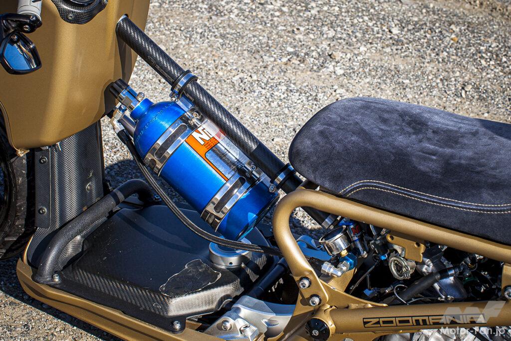 エンジンは燃焼室内に亜酸化窒素を送り込むことで驚異的な加速を発揮する、ドラッグレースの定番「NOS(ナイトラス・オキサイド・システム)」を採用。亜酸化窒素が密封された青色のボンベは、フットレストスペースに設置されたサブフレームの下にレイアウト。