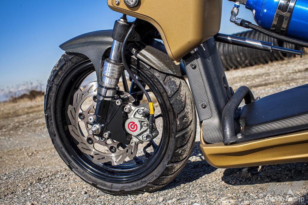 オシャレなデザインのリアホイールは、超ワイドなPCX用12インチ7Jサイズの「Hurricane wheel For PCX 」を導入し、極太の130/70-12タイヤを組み合わせ。フロントは12インチキャストホイールに110/60-12タイヤをコーディネイト。