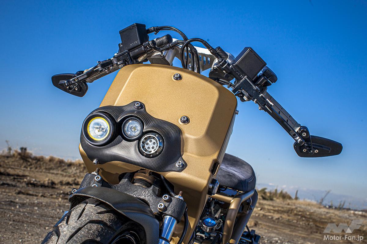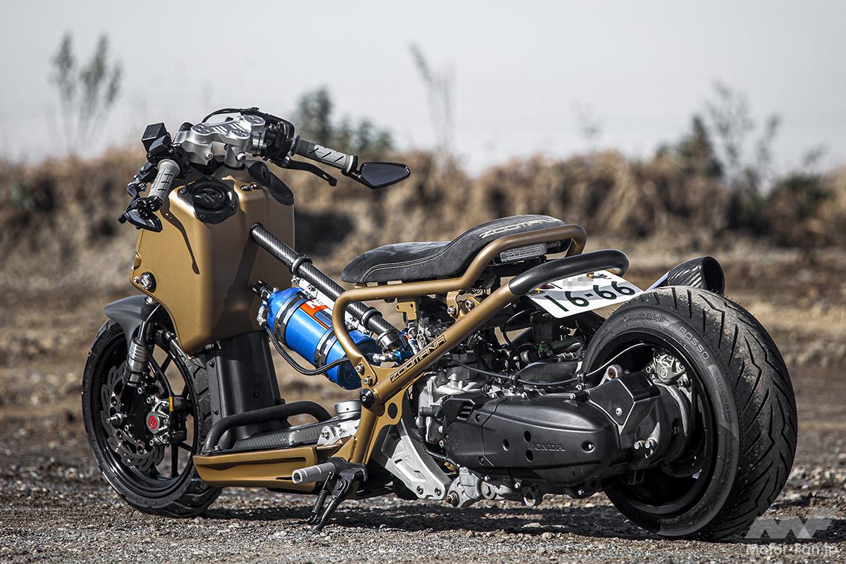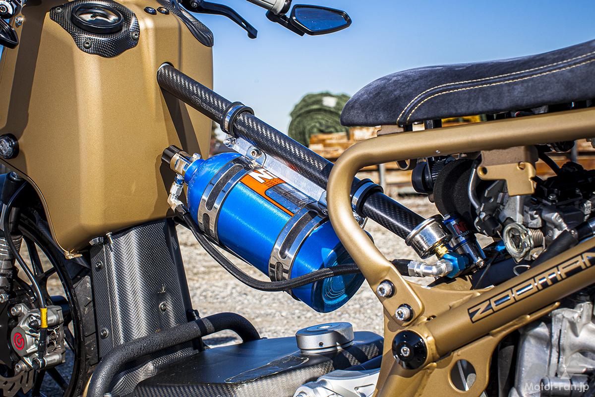 ヨシムラジャパン製マフラー、3連のプロジェクターヘッドランプ、カーボン製フロントフェンダー、肉薄のスライスシートなど、ズーマーのフォルムを活かしたアイテムが随所に投入されている。