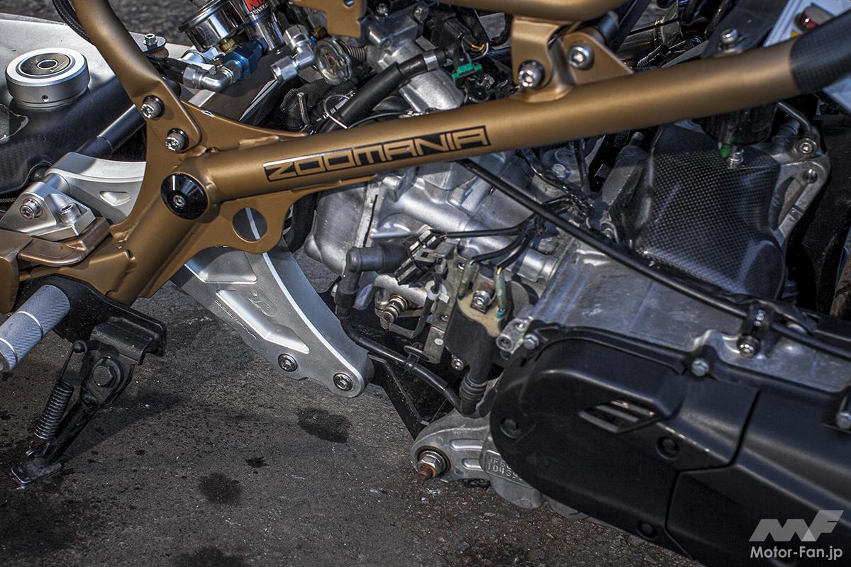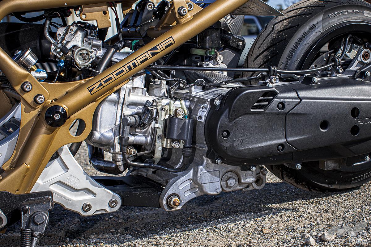 ホンダ ズーマー+ホンダ PCX125/150用エンジンの組み合わせが人気の理由。それはワイドホイールが履けること。車体とエンジンが同メーカーであること。(一般的にバイクのカスタマーは、同メーカーにこだわるユーザーが多い)。車体とのマッチング性が良好なこと。ノーマルのズーマーと同様、高性能な水冷式であることだ。