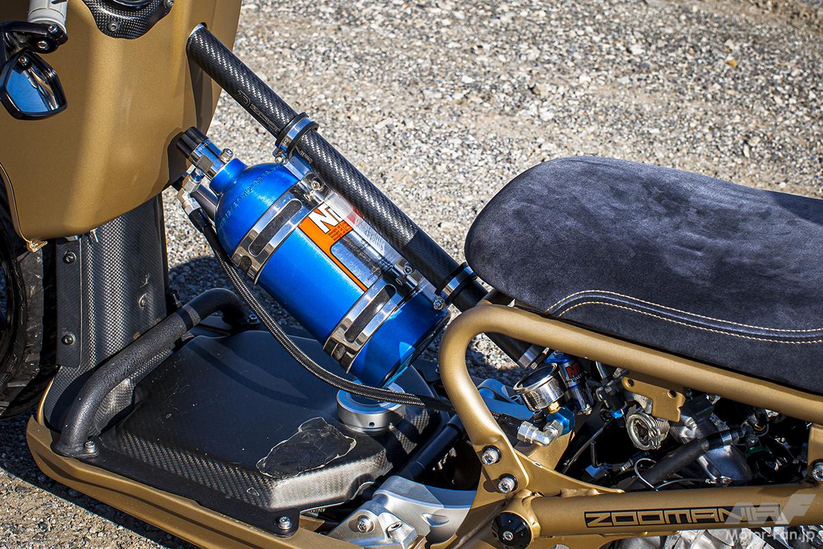 エンジンは燃焼室内に亜酸化窒素を送り込むことで驚異的な加速を発揮する、ドラッグレースの定番「NOS(ナイトラス・オキサイド・システム)」を採用。亜酸化窒素が密封された青色のボンベは、フットレストスペースに設置されたサブフレームの下にレイアウト。
