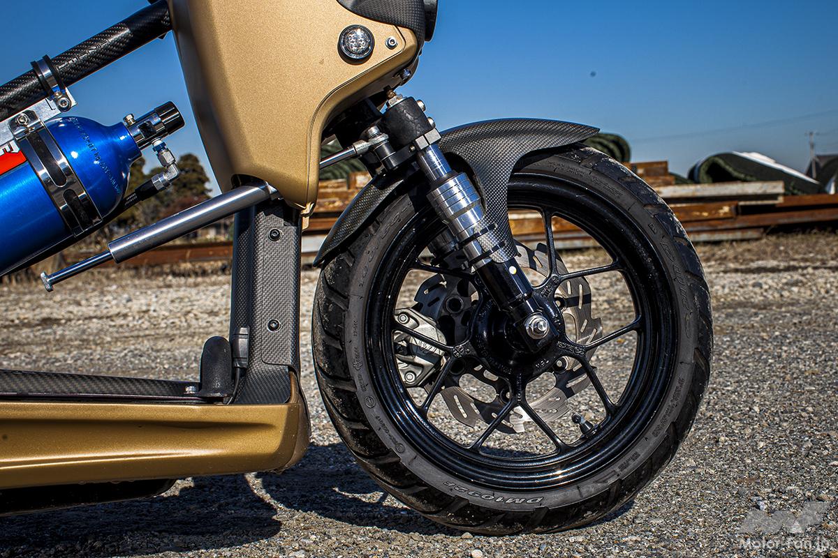 オシャレなデザインのリアホイールは、超ワイドなPCX用12インチ7Jサイズの「Hurricane wheel For PCX 」を導入し、極太の130/70-12タイヤを組み合わせ。フロントは12インチキャストホイールに110/60-12タイヤをコーディネイト。