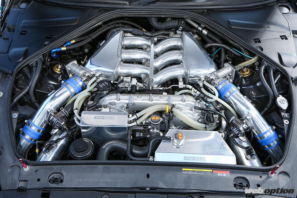 心臓部は800psオーバーのポテンシャルを持つオリジナルのB.B.800タービンを装着し、780ps/100kgmもの出力を発揮するVR38DETTユニット。バフ仕上げが美しいオリジナルのサージタンクは、容量の最適化と内部にファンネルを装備するなどして、ブーストアップから1000psオーバーまで対応する。なお、コストパフォーマンスを考慮し、エンジン内部には一切手を入れていない。
