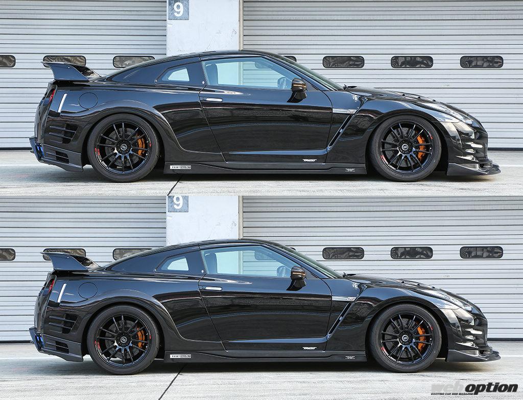 こちらは車高を完全に上げた状態と下げた状態の比較写真。油圧機構は30mmの調整幅を持つので、フェンダーとタイヤのクリアランスを見てもらえば一目瞭然だろう。なお、タイヤ&ホイールは、エンケイGTC01にトーヨープロクセスR888(FR285/35R20)という組み合わせだ。