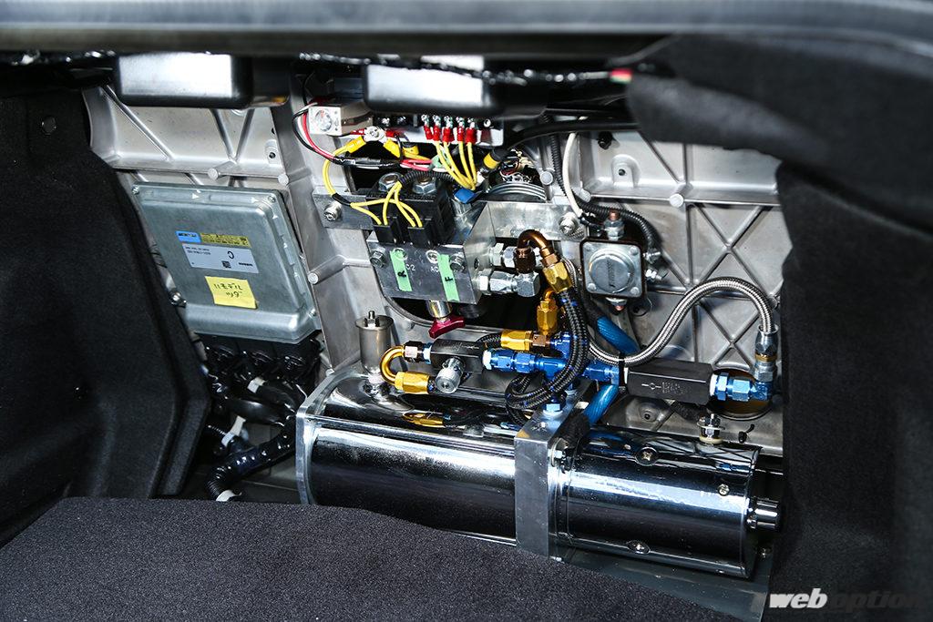 油圧を管理するタンクはトランク内に設置。トランク容量を圧迫しないコンパクトなサイズが魅力的だ。ここから各車高調に繋がる別体タンクにオイルが送られ、車高が調整される仕組みとなる。
