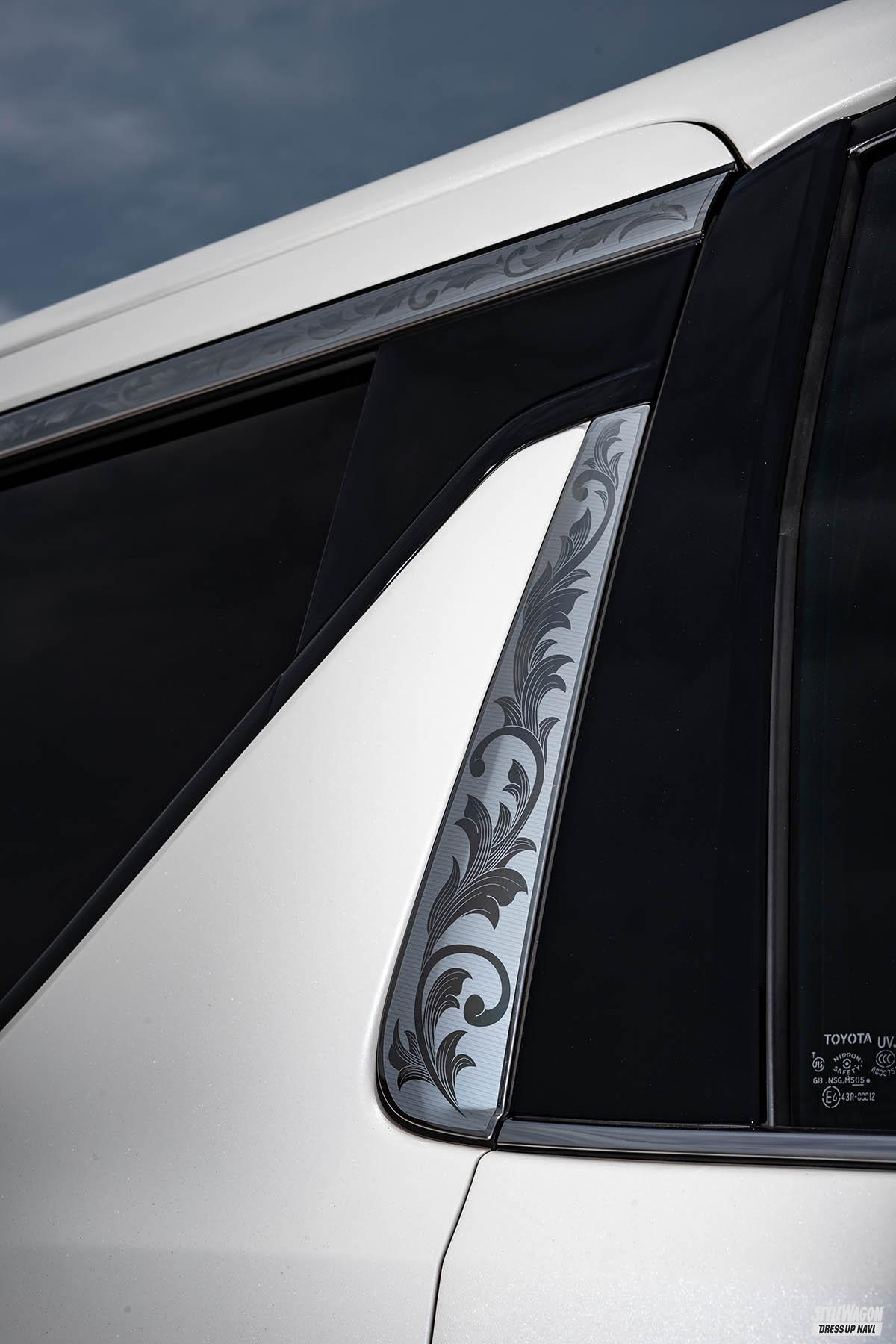ノンエアロのワイド&ローでシンプルに仕上げたいといったユーザーにもうってつけのナチュラルアクセントとなるプレカットデカール。アルヴェルの魅せポイントとなるメッキパーツを後付け感なくアップグレードできるのがポイントだ。フル施工でゴージャスさに磨きをかけても部分施工で魅せても、メッキパートが美しく映える!