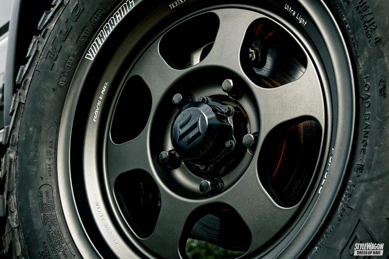 TE37XT foR JULは、この慣性モーメントを向上させるために、ホイールに求められる資質を磨き抜いたフォージドモデル。履けば制動時のスムーズさや切り返しの滑らかさなど、ジムニーの動きが明らかに変わるという実に機能的な一本なのだ。