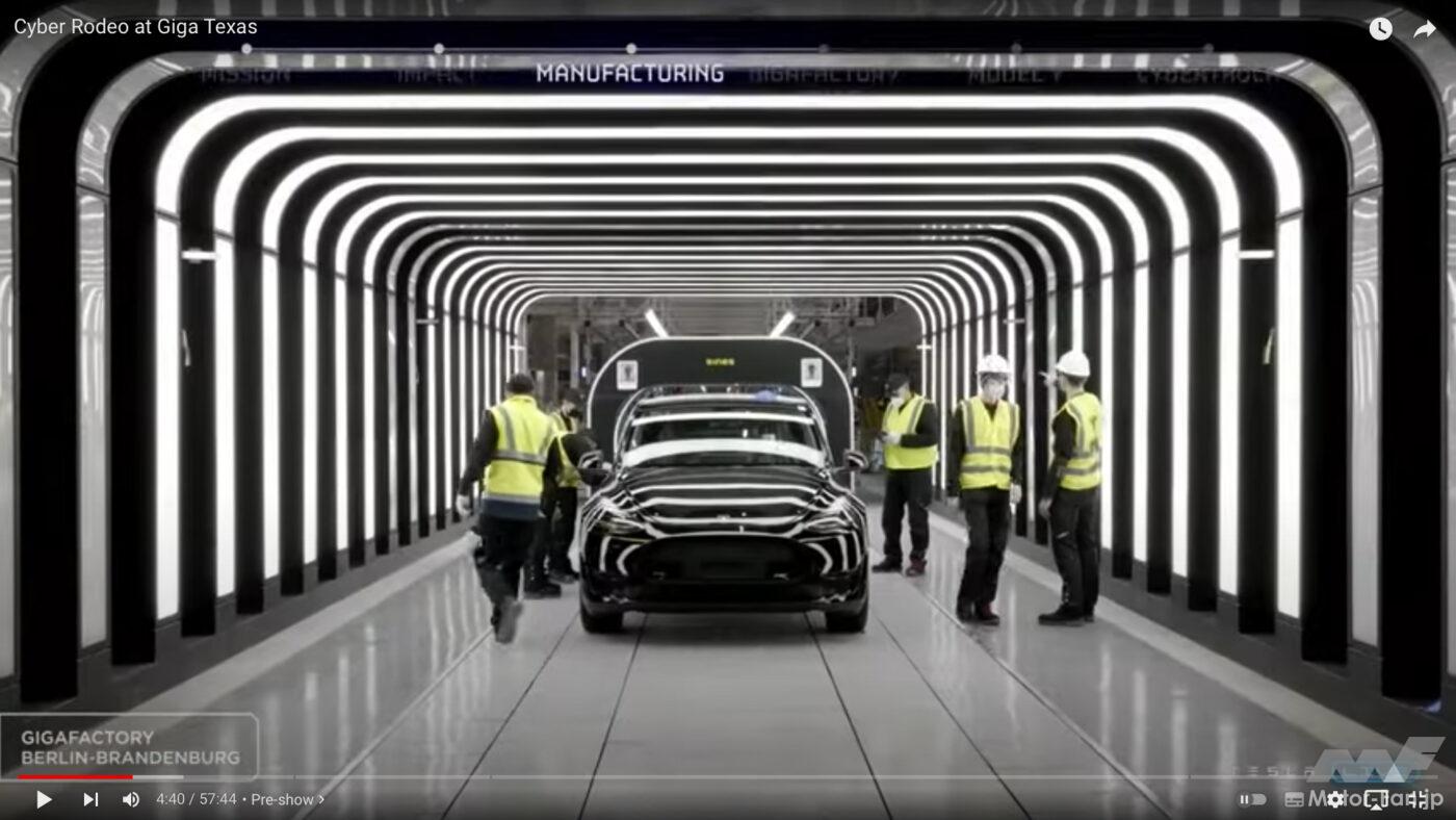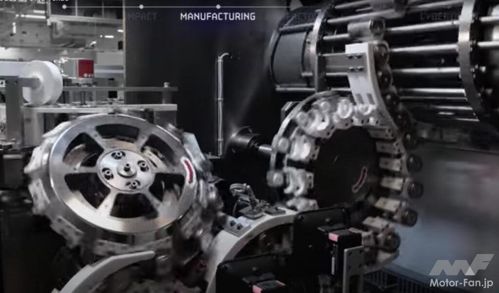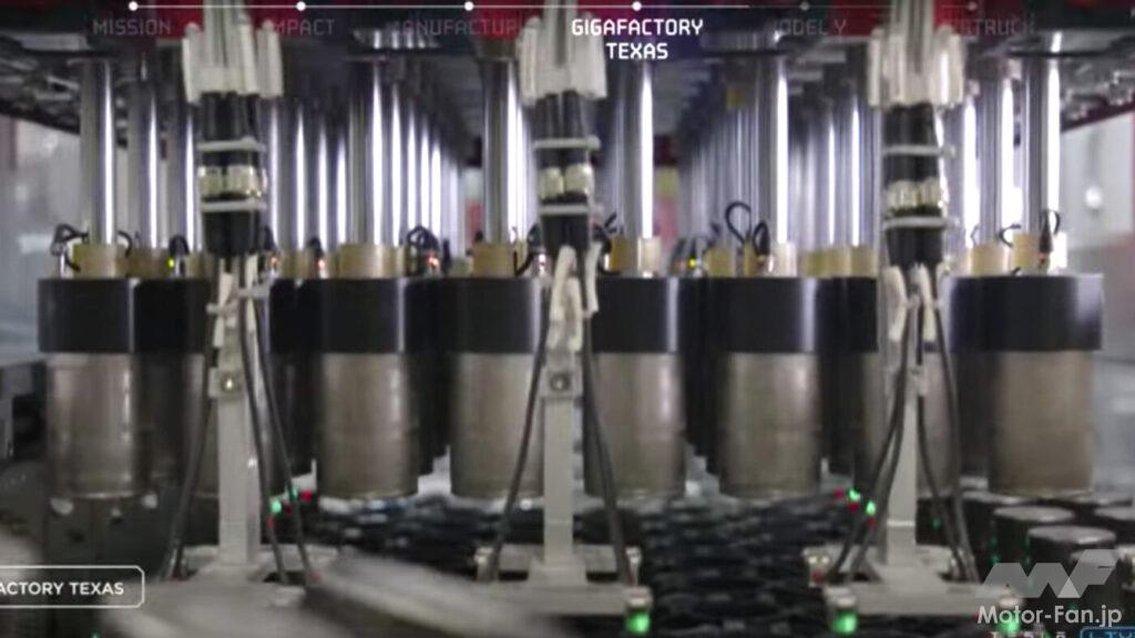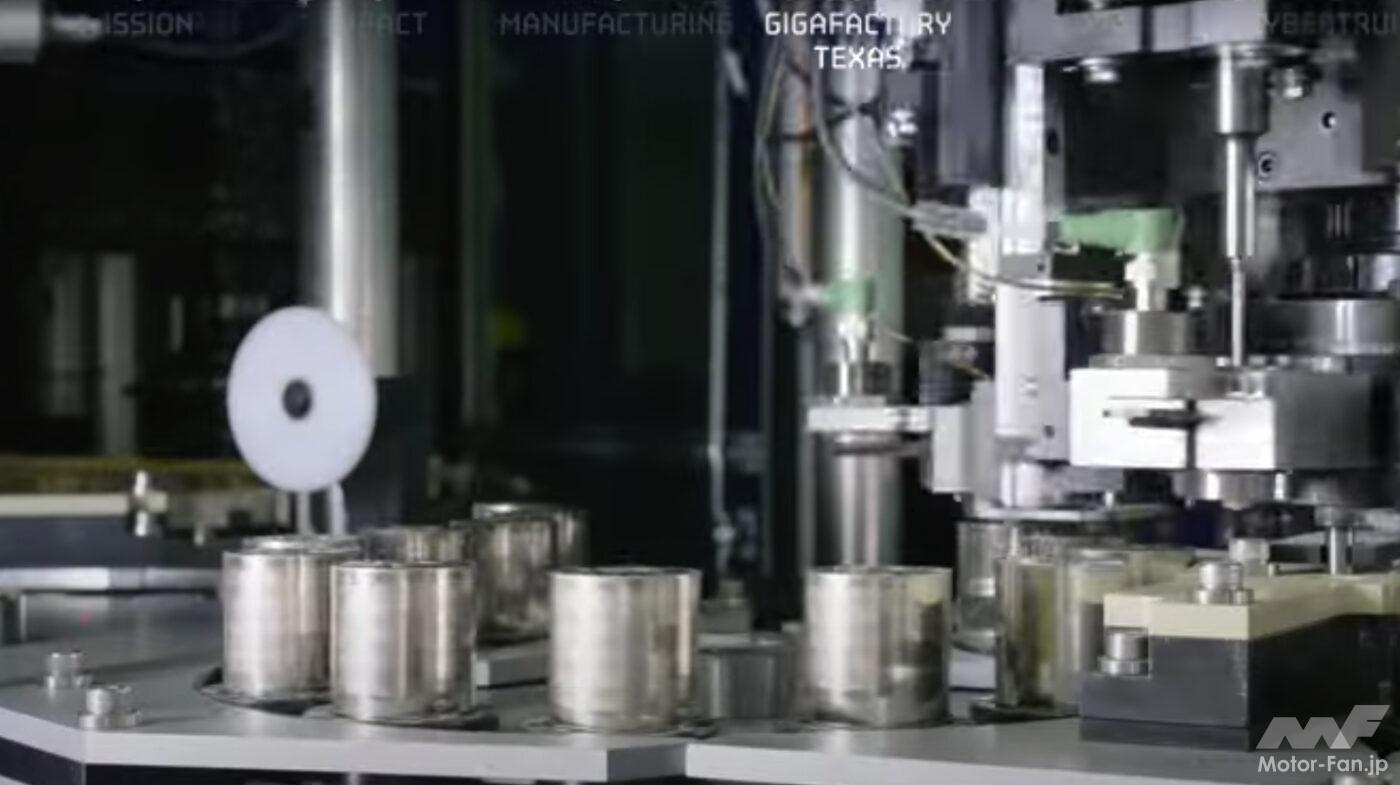 後編もテスラが配信したビデオをベースに解説する。車体とは別に独立した製造ラインで作られるLIB(リチウムイオン2次電池)は、テスラ独自サイズの4680(直径46mm×長さ80mm)と呼ばれる円筒形である。創業時は18650(直径18mm×長さ65mm)というラップトップコンピューターなどに使われていた汎用電池を使っていたが、テスラはテキサス工場稼働に合わせて4680型を導入した。LIBの構造にはパナソニックがトヨタのHEV(ハイブリッド・エレクトリック・ビークル)用に開発したタブのない構造などが応用されているとのことだが、詳細は不明だ。