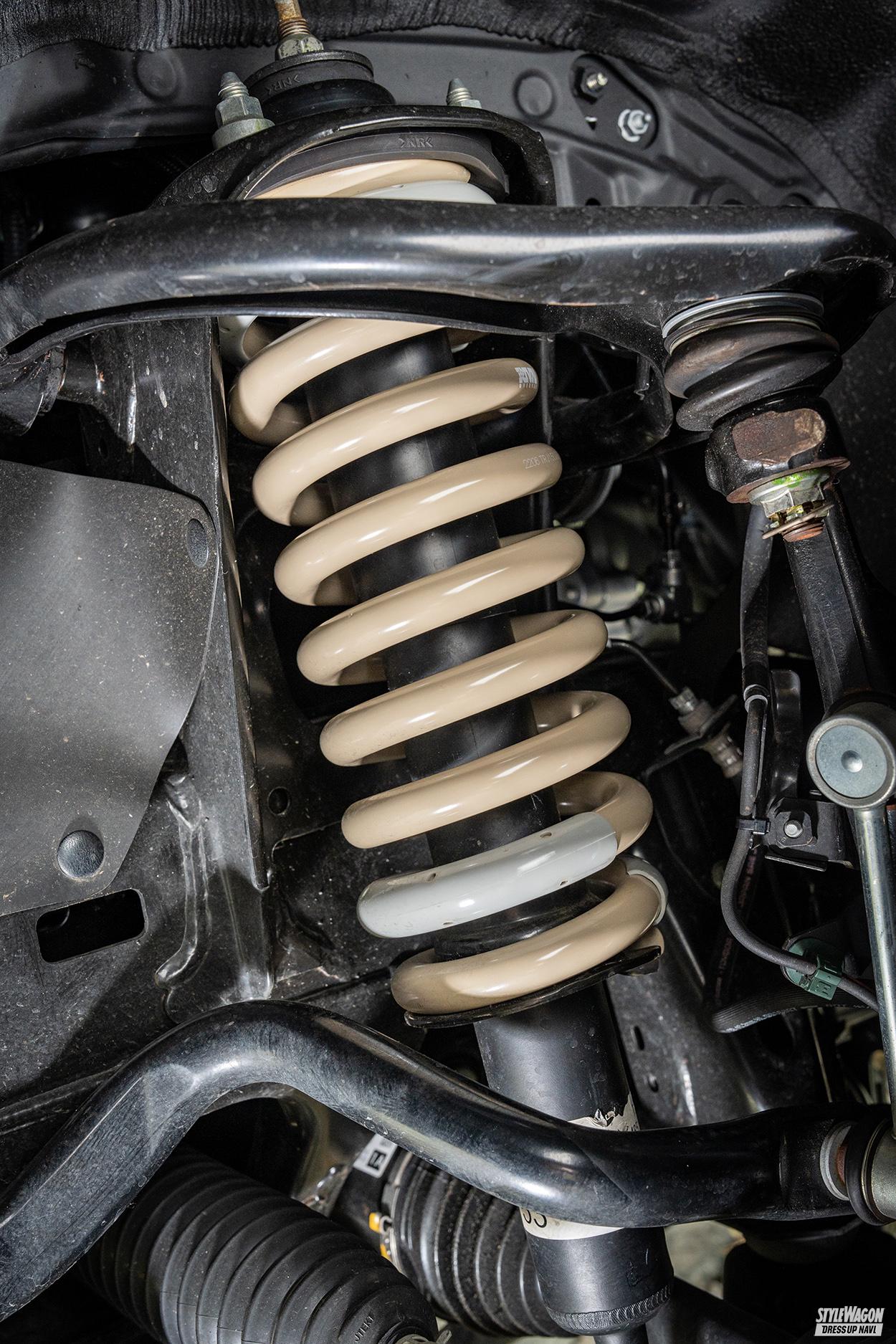 なんといってもその魅力は、スプリングの交換だけでトレンドのアゲ仕様が実現できるトコロ。乗り心地に配慮した設計により、装着後の快適性もバッチリ。リフトアップ量が法定基準内というのもうれしいところだ。また、オフにピッタリなアースカラーが採用されている点もポイント。タイヤとフェンダーの隙間からチラリと見えるスプリングは、さりげなくオシャレな雰囲気をプラスしてくれる。