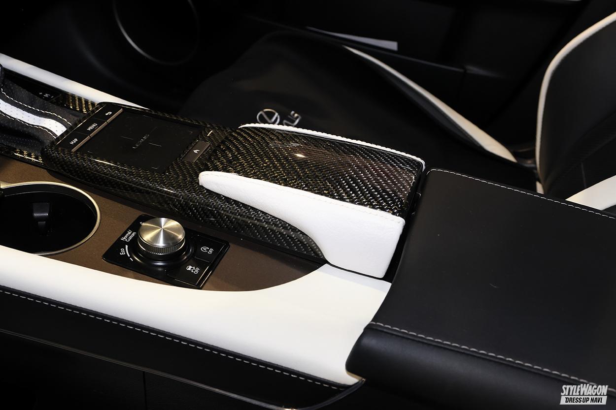 60ハリアーを前期後期乗り継ぎ、このRXに乗り換えたJun工房さん。想像がつくと思うが前車もだいぶイジッていて……。このRXはバランス良い仕上がりが特徴だが、とりわけ内装に注目したい! リアルカーボンでカスタムされているのだが、パネル類のカーボンは、なんと自作なのだという!! 生地を貼って、樹脂を乗せていく、プロと同じプロセスで製作していったのだ。車内を見せてもらうと、確かに深みのある織り目はリアルカーボンならでは。ここまでできるなら、確かにDIYでやってしまうかも! 「自分でできるコトは自分で」コレがオーナーのポリシーだ。