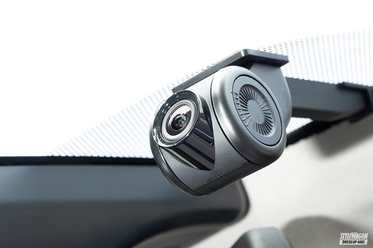 HDディスプレイを搭載したパナソニックのAV一体型ナビ「ストラーダ」専用のドラレコ。薄型の本体に2つの小型カメラをセットした3ピーススタイルだ。