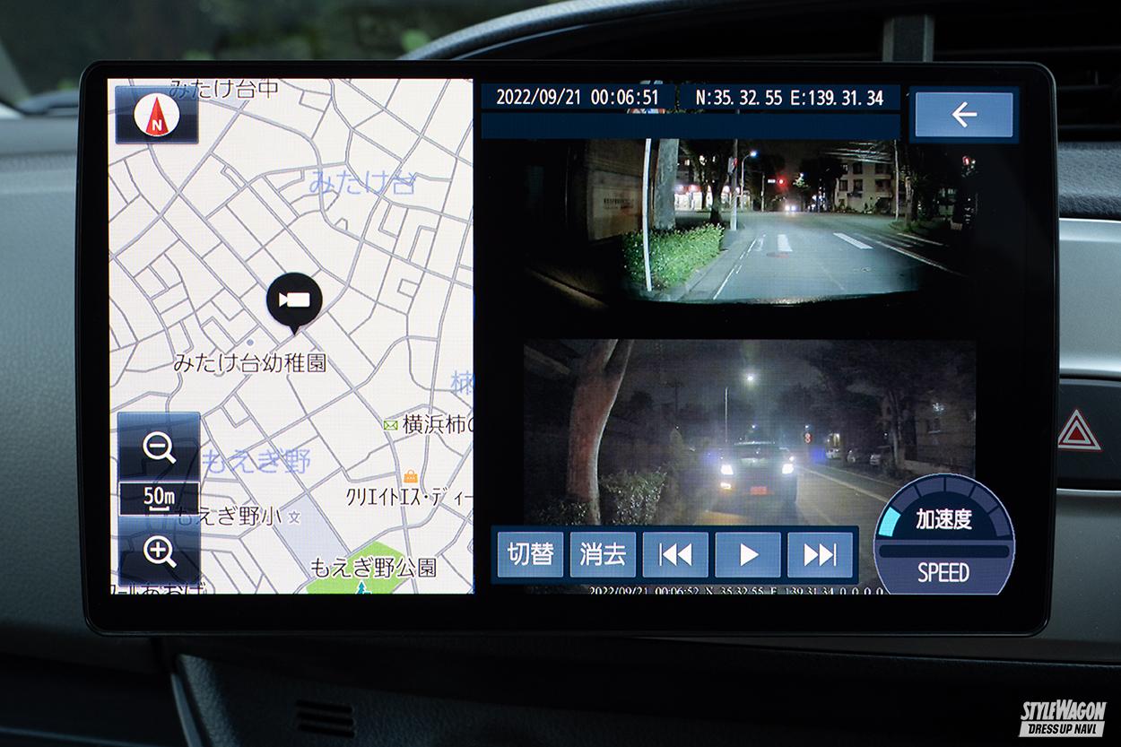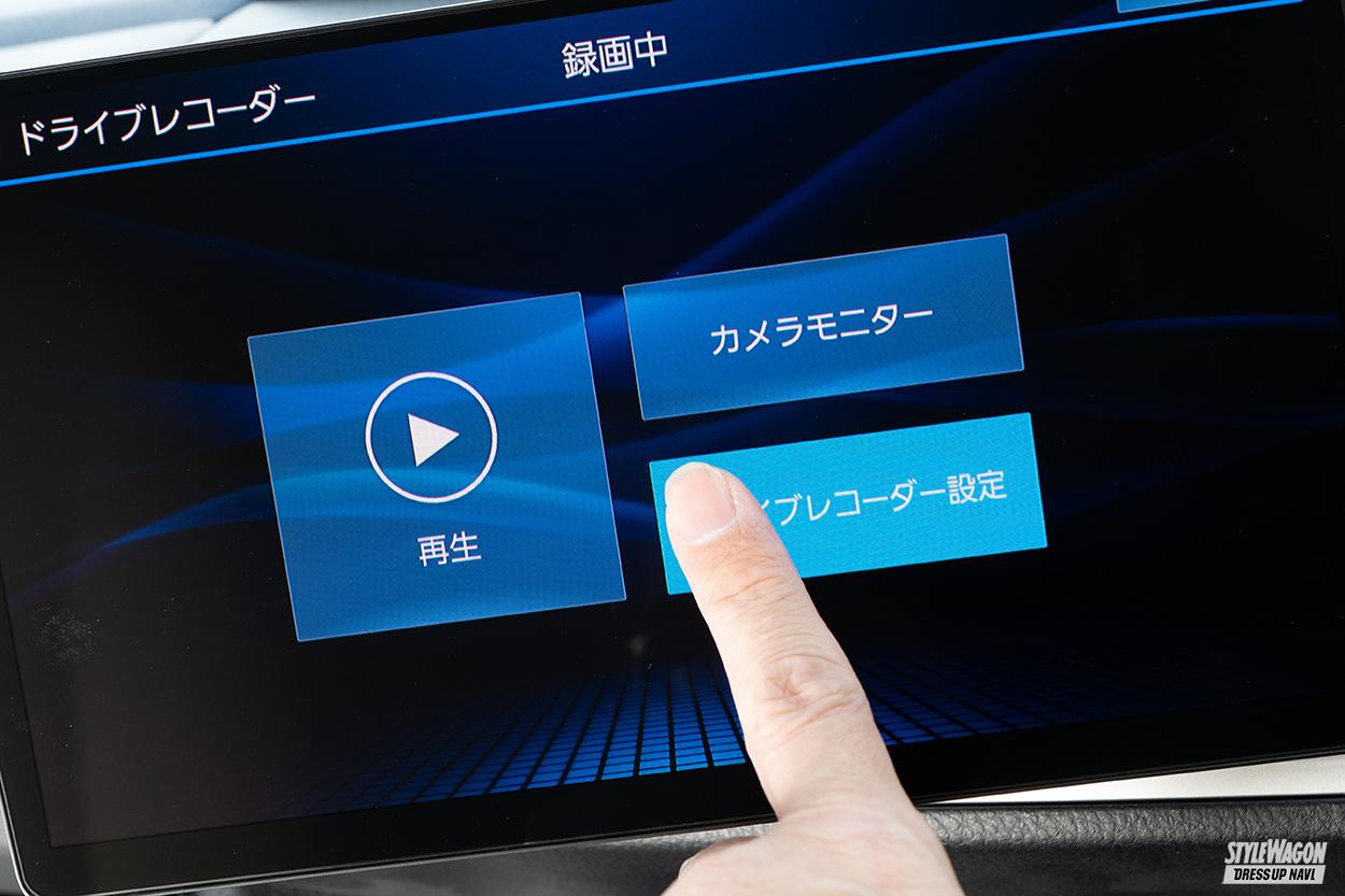 そしてドライブレコーダーに関する各種の設定は、ナビのメニュー画面からタッチパネル操作で行える。他の内蔵機能と同様の使い心地で迷わず直感的にコントロールOK。