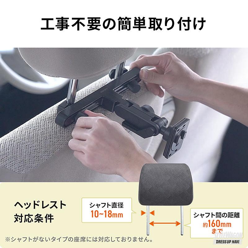 ヘッドレストのシャフト直径10〜18mm、シャフト間距離が約160mmまでのヘッドレストに対応。取り付け部分をヘッドレストのシャフトに合わせて固定するだけで取り付けは完了。
