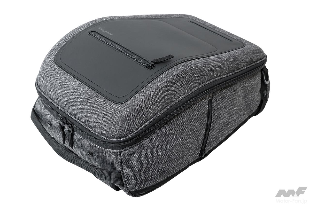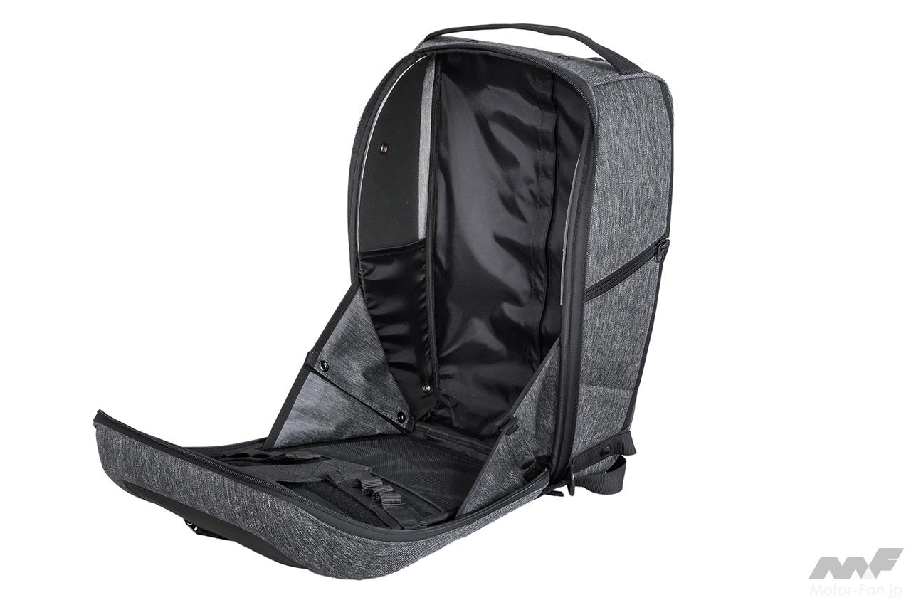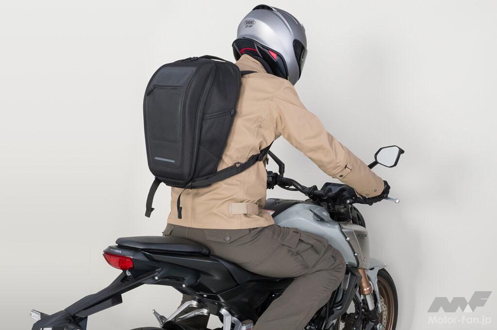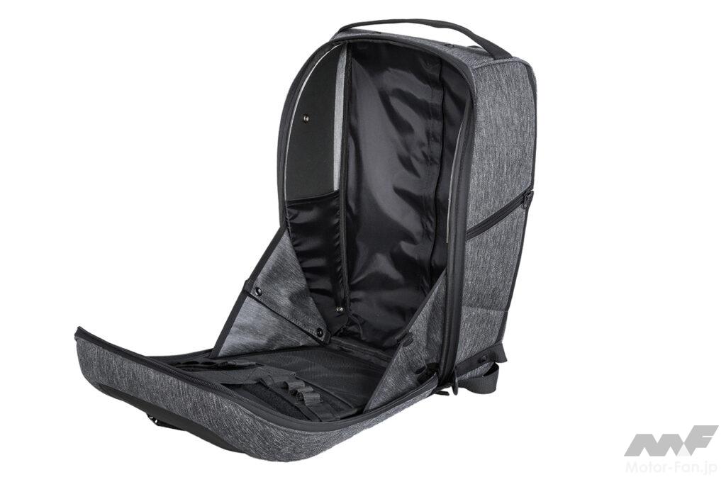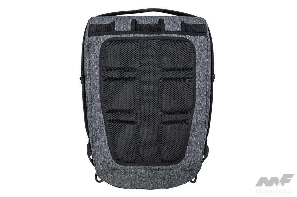 また風の影響を受けにくい、流れるような美しいフォルムを保持することにより、ライディング時の安定感を向上させているのもポイント。荷重を分散させる特殊形状により、ザックとして使用時はライディングウエア着用時でも、背中を優しく包み込むような絶妙のフィット感を実現している。
