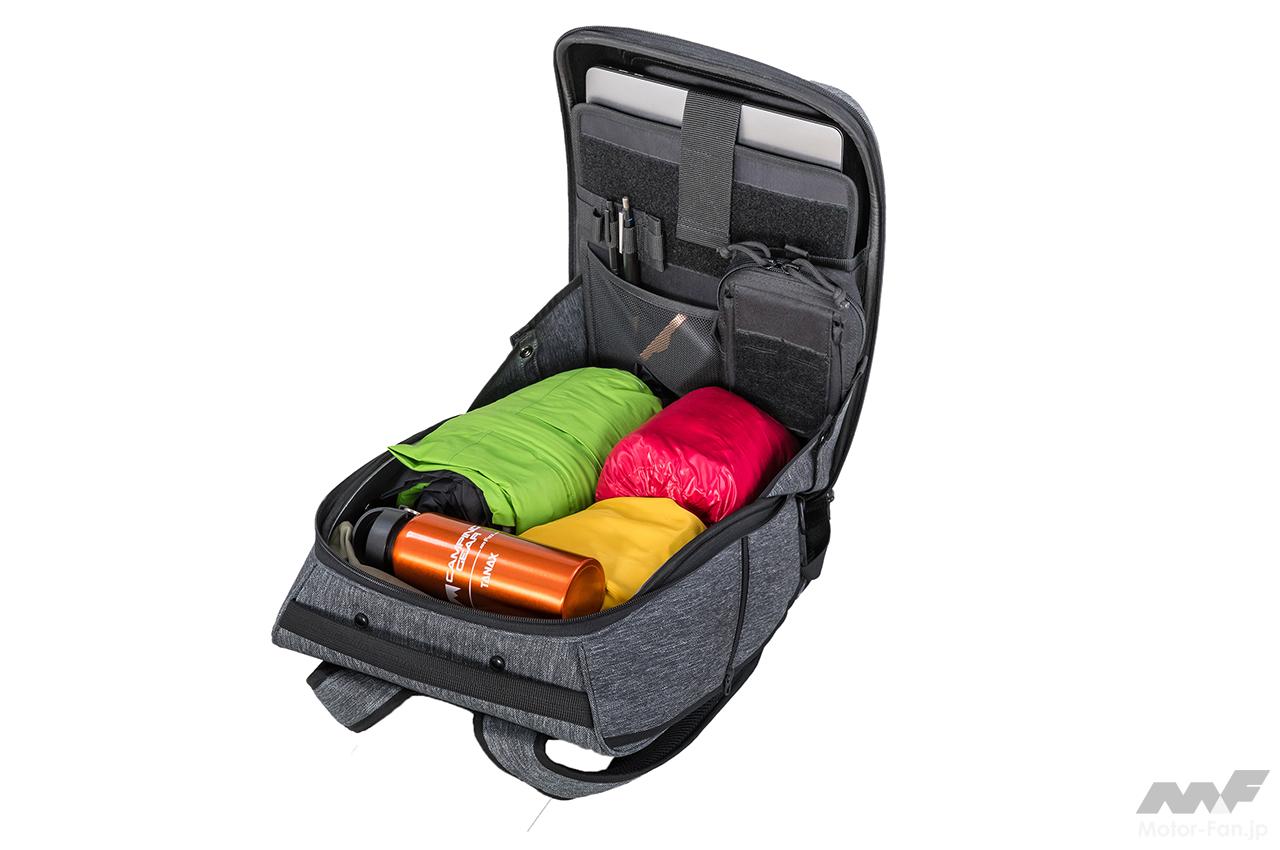 内部は多種多様なポケットを設けるなど、日常での使い勝手を追求した便利なつくり。パソコンなどの精密機器は、フロート構造の上面フラップ内側に収納することで、車載しても振動による影響を受けづらくなる。