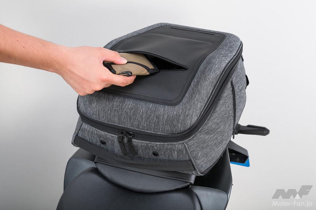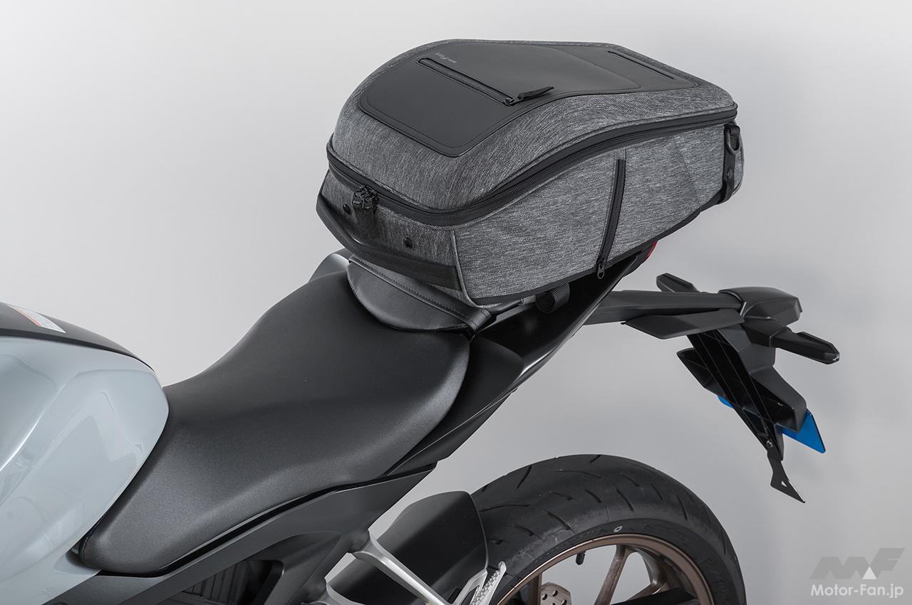容量は通勤や通学、1泊ツーリングに最適な18Lを確保。A4ファイルも収納OK。突然の雨も安心のレインカバー付き。