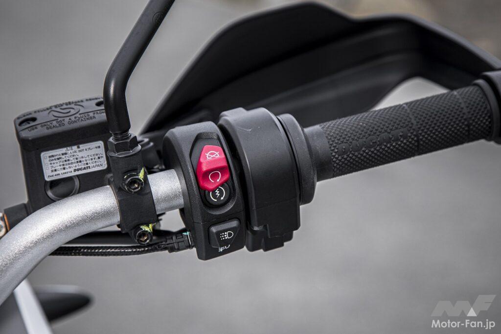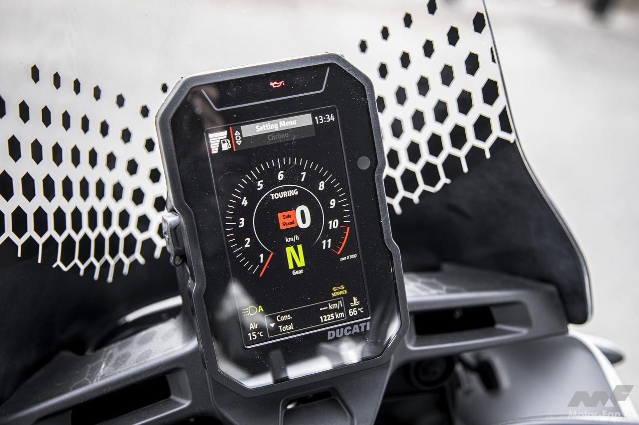 始動すると歯切れのあるVツインサウンドが頼もしく響きます。テスタストレッタ11°エンジンのパワフルさは実証済みで、性能に不足はありません。現代のバイクらしくデザートXにもさまざまな電子制御システムが導入されていて、ライディングモードに関しては、スポーツ、ツーリング、アーバン、ウエット、ラリー、エンデューロの6モードに切り替えができます。もちろんこれらは、それぞれの特性に適したABS、トラクションコントロール介入をするシステムとなっています。ちなみに、フルパワーである最高出力110psはスポーツ、ツーリング、ラリーモード時に発生し、アーバン、ウエットは95ps、エンデューロでは75psの最高出力にとどめられる設定です。