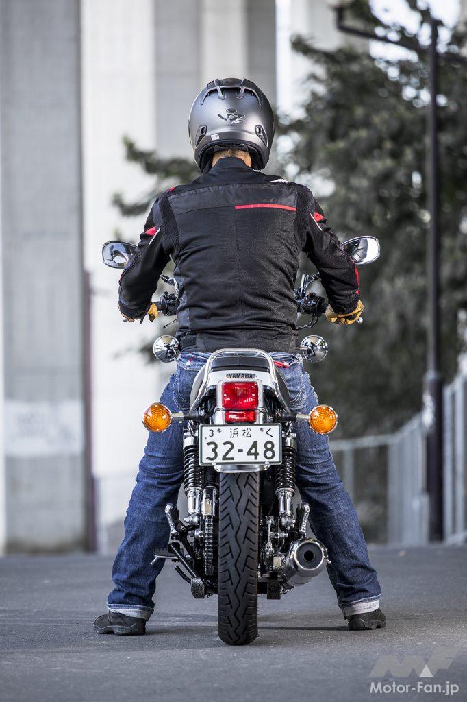長いモデルライフの中で、’80年代半ばにバックステップ化+ハンドルが若干低くなり上体が前傾化する変更があったが、以後は元の位置に戻り、写真のようなリラックスポジションとなる。身長173cmのライダーの両足接地では余裕でカカトまで着く。