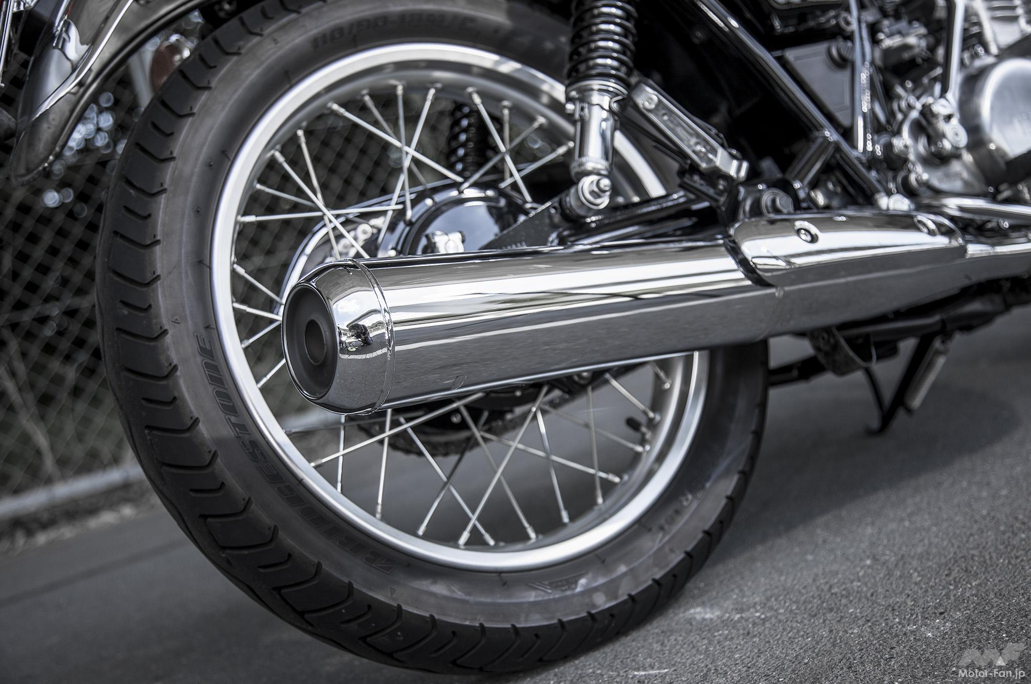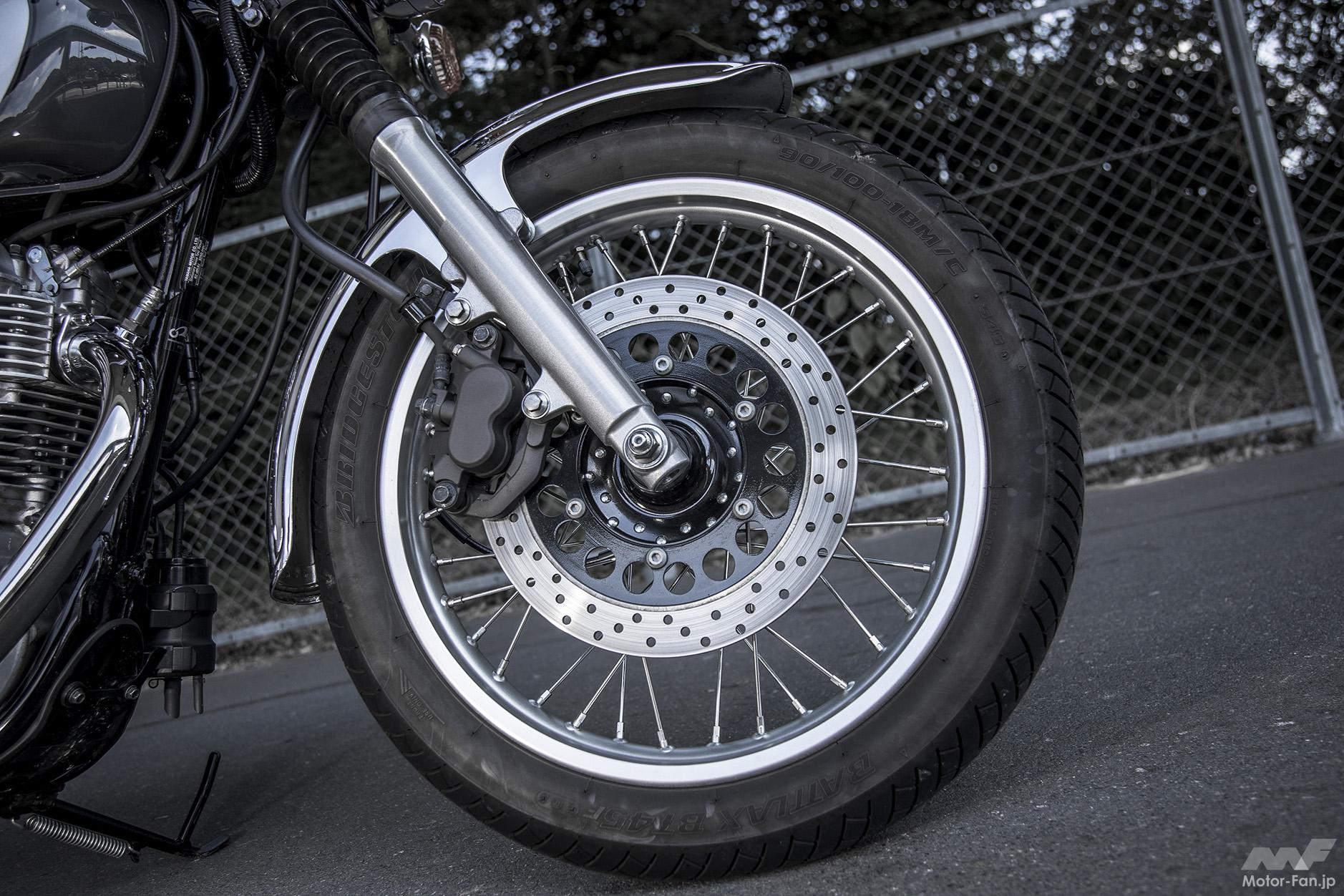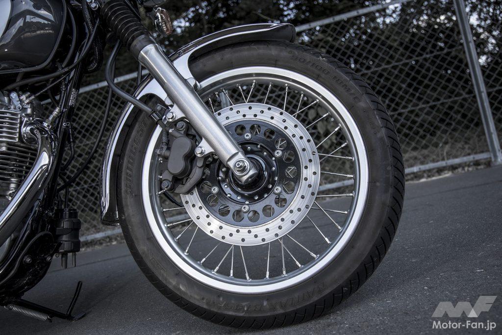 ’01年モデルから前輪はディスク化。それ以前のドラム式もSRには似合っていたが、素直な制動タッチとレスポンスではこちらに軍配が上がる。マフラーは’18年型以降型に準じた仕様で、内部構造の変更とエンドパイプの若干の大口径化などで、従来型よりも歯切れの良いサウンドになったという声は多い。標準装着タイヤはBS製のオールラウンドなロード用バイアスタイヤのBT45。
