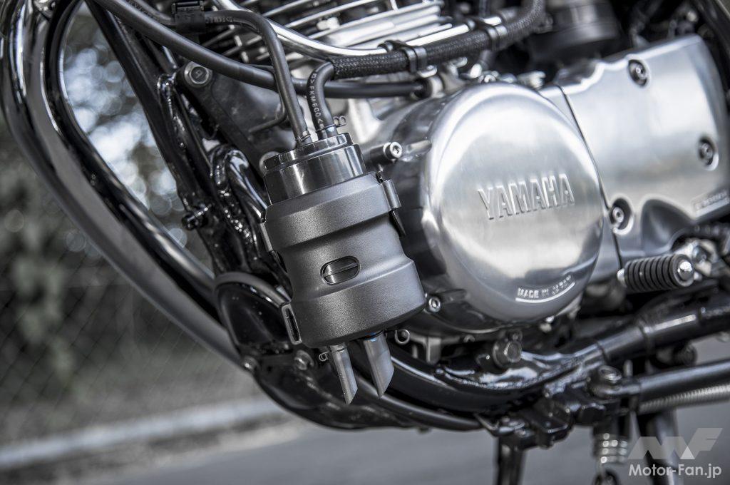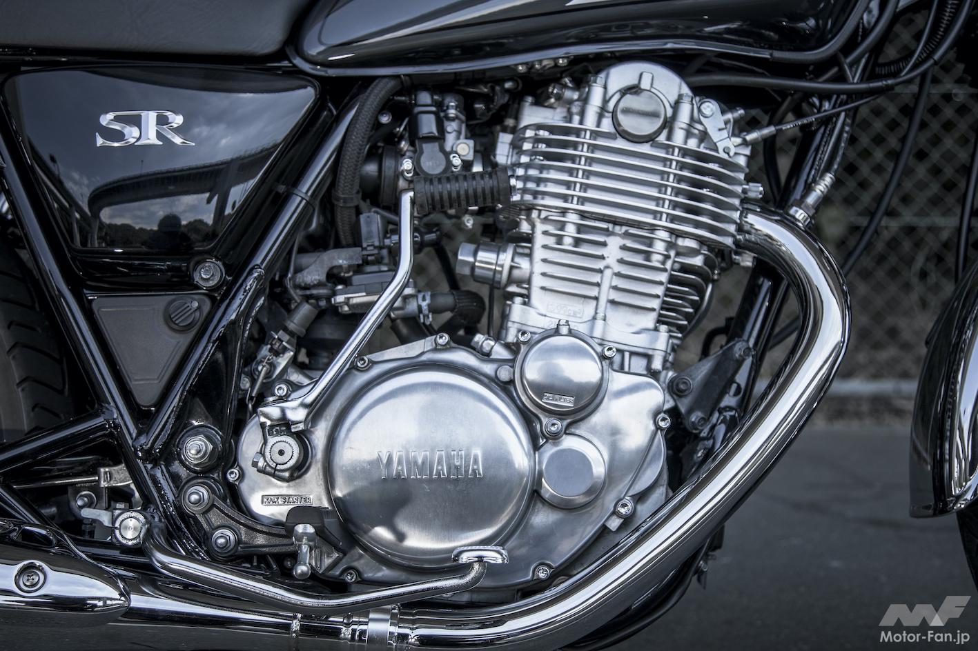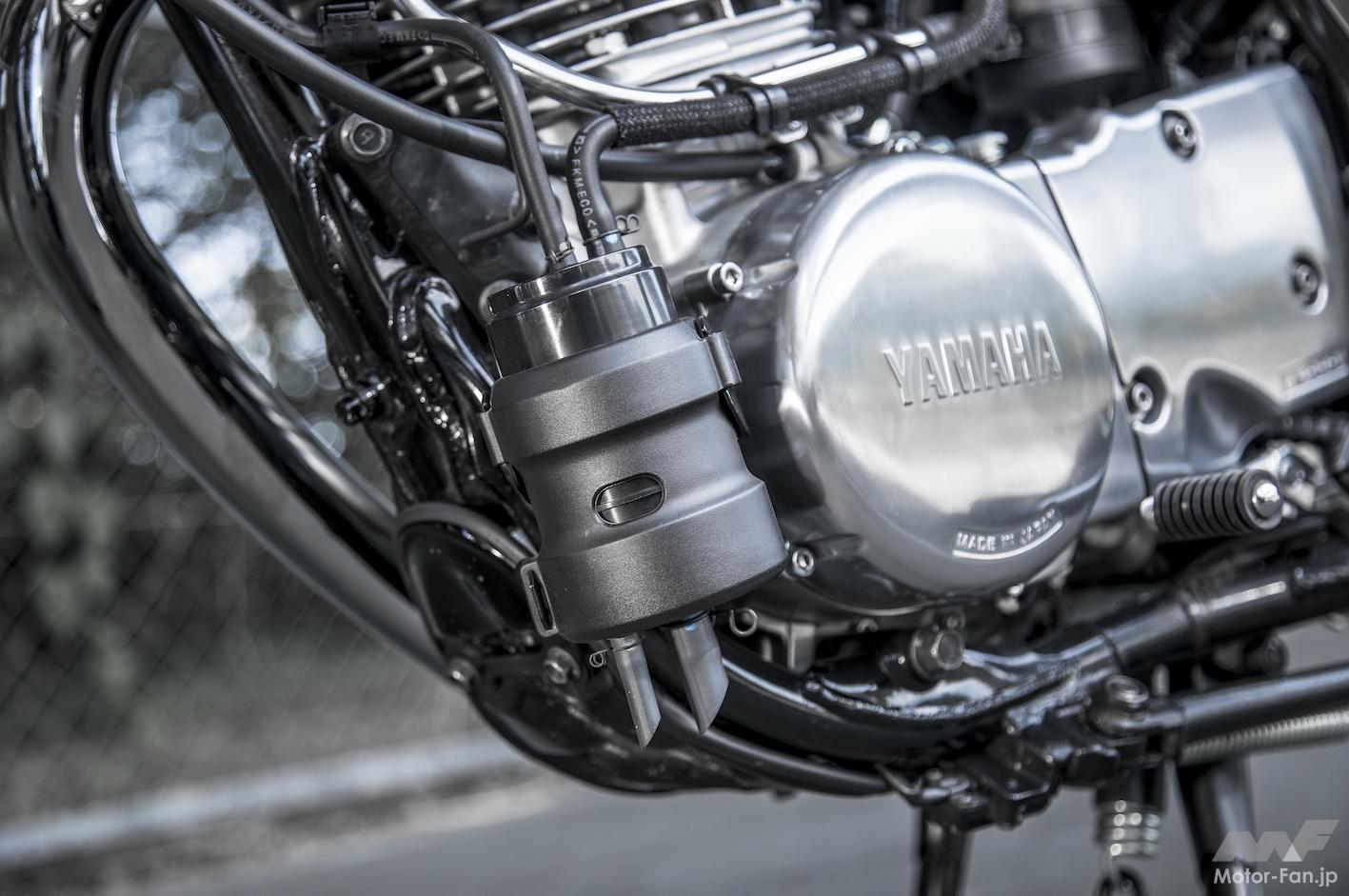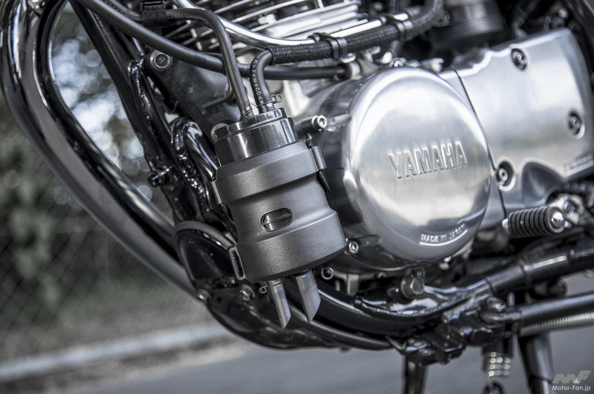 ’10年型でSR400がFI(フューエルインジェクション)化された時、タンクの底部形状を変更し(この際容量は14→12Lに減少)、左サイドカバー内部にフューエルポンプを新設し、シート下にはECUを付加(シート裏形状を変更)するなど、ヤマハ開発陣は諸々の見直しをしてSRらしいフォルムの維持に努めた。同時に、性能スペック向上はままならないものの、始動性や低中速域のレスポンスを磨いて、使い勝手をよくしている。そして’18年の排出ガス規制対策では、エンジン左前にキャニスター(蒸発ガソリンの大気放散を抑制する装置)が付加された。極力目立たぬようにダウンフレーム下部に添わせるように置かれ、SRらしいソリッドなエンジン造形に配慮されている点に苦心が見える。