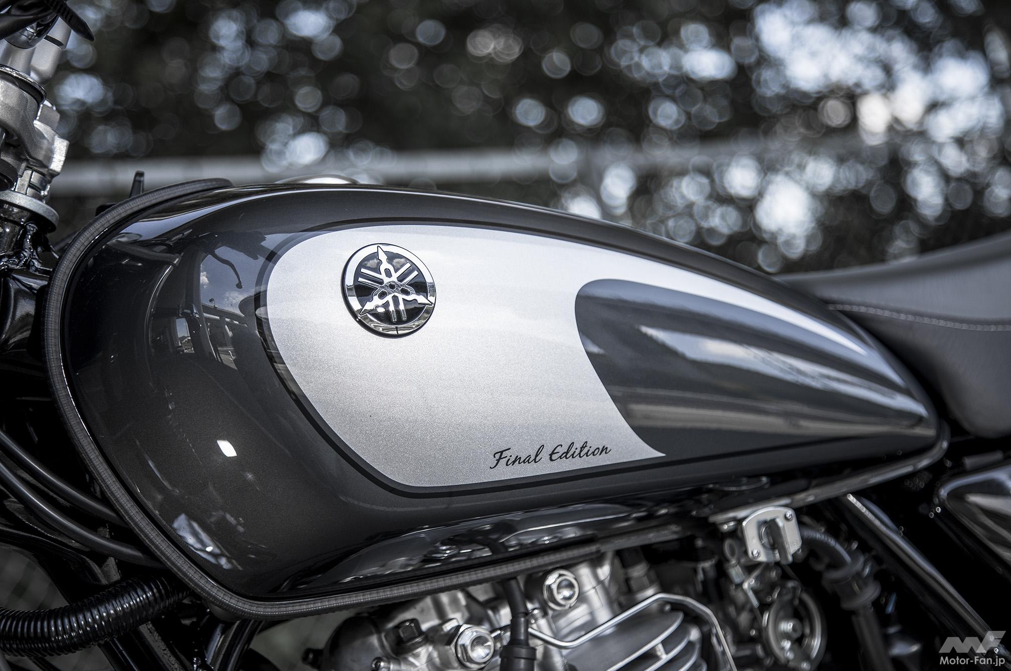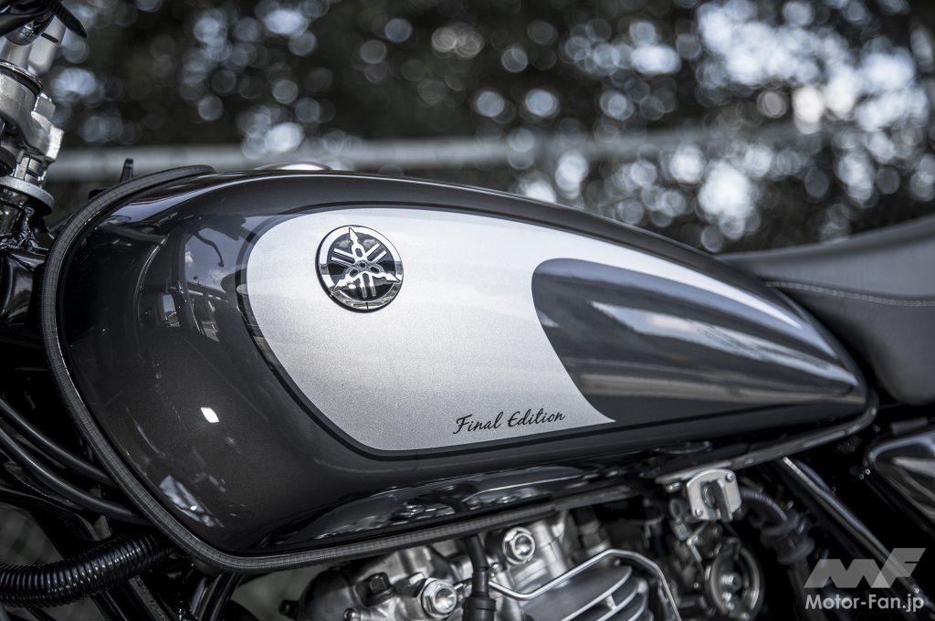 ’21年3月15日発売のSR400ファイナルエディション。写真のダークグレーメタリックはタンク音叉マーク周辺の明るいシルバー系のグラフィックが、SRらしさを感じさせるツートーン色。このほかタンク部にYAMAHAマークが入るブルー系モノトーン色も用意(こちらはサイドカバーにファイナルエディションの表記が入る)。なお、これら標準色以外に、サンバースト塗装のヤマハブラックをまとったファイナルエディション・リミテッドも1000台限定、74万8000円で同時発売された。