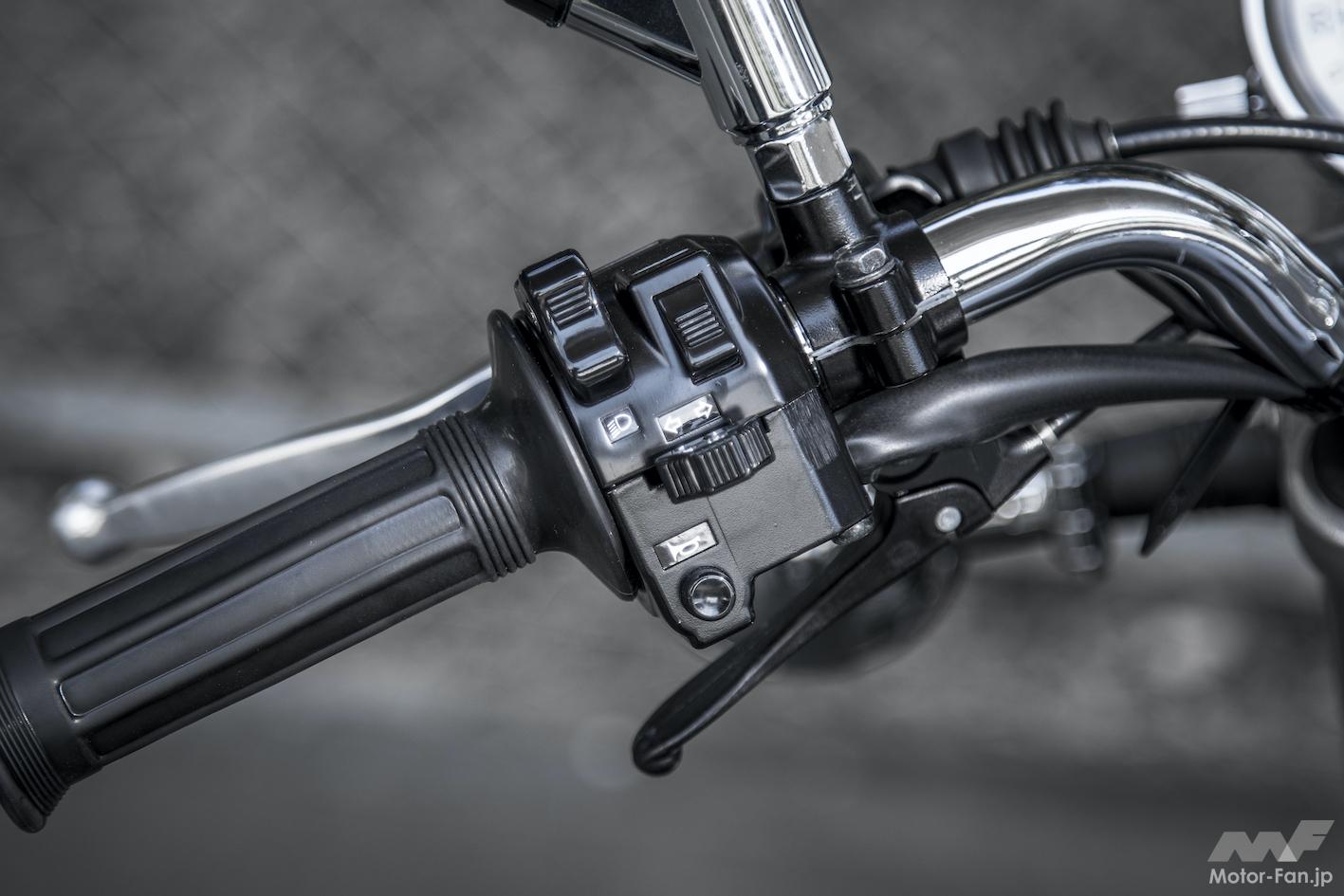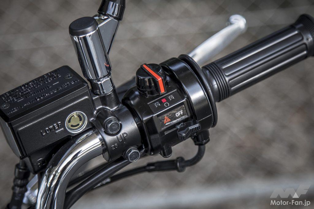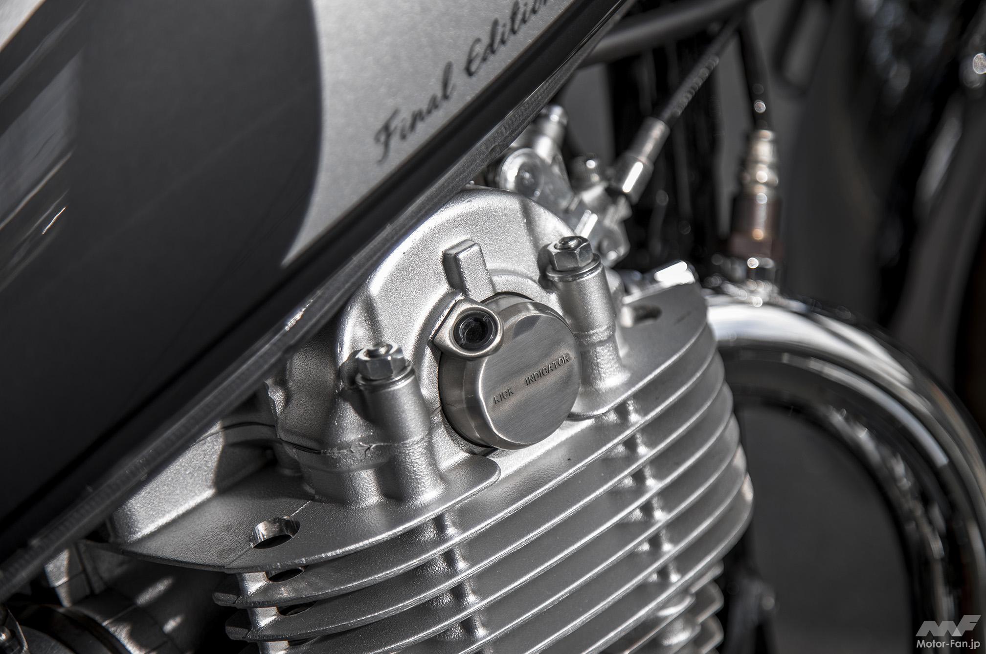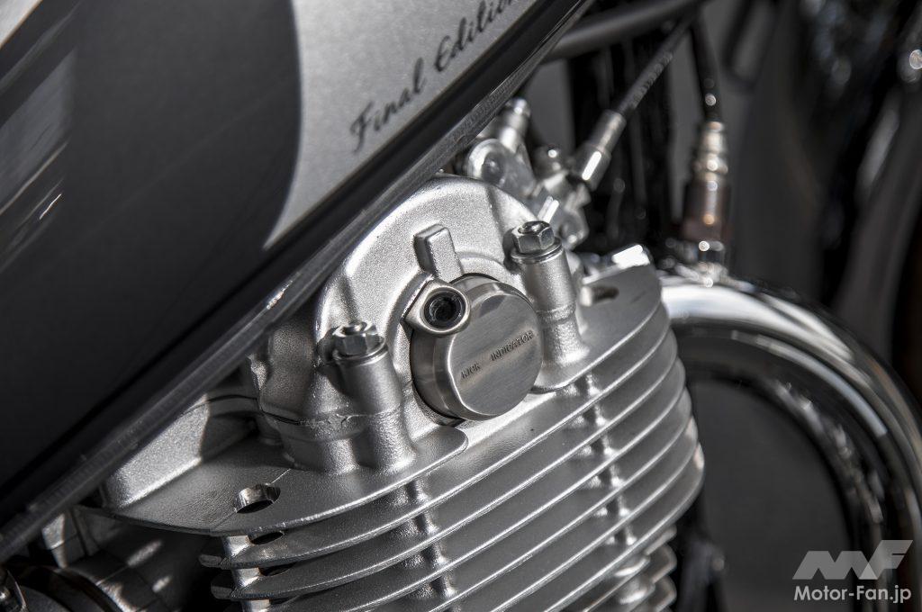 同車のベースとなるのは、’18年の排出ガス規制対策モデル。エンジン左前下部に置かれたキャニスターがその対策装備の一つで、ほかにFIのセッティング変更、マフラー内触媒の構造なども見直されている。他にFI化(’10年型)以降の変更点として、左サイドカバー内にフューエルポンプが設置され(従来はバッテリーを配置)、シート下内部にFI制御用のECU(エンジンコントロールユニット)とバッテリーが配置されたことで、シート裏形状などが変更されている。